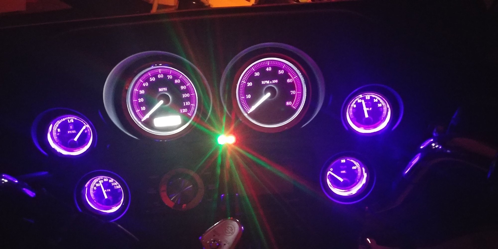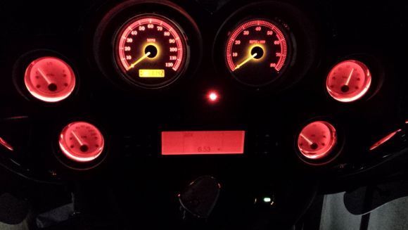 I have the blue with red needles on my 12 CVO RG. My dilemma now is trying to put blue leds in the console logo. Anyone know where to find a wide flat style group of blue leds to use? I tried strips and multiple pods and the lighting is not even.