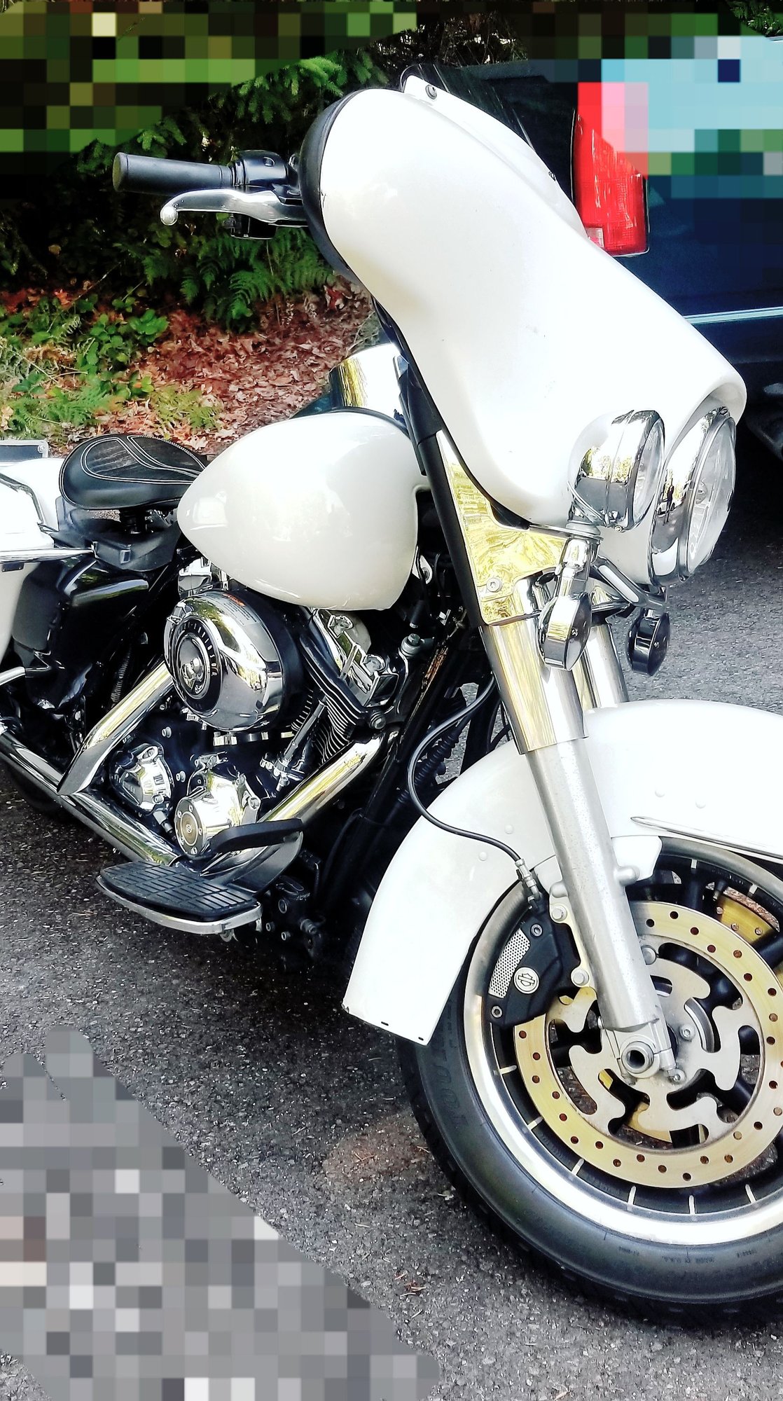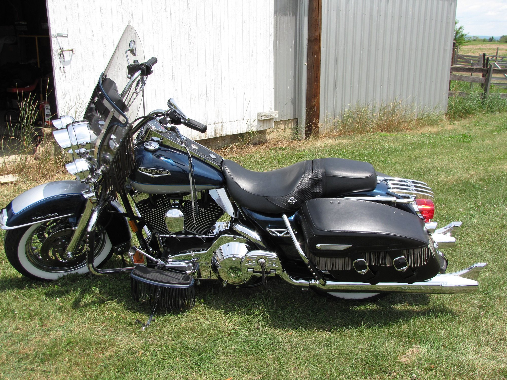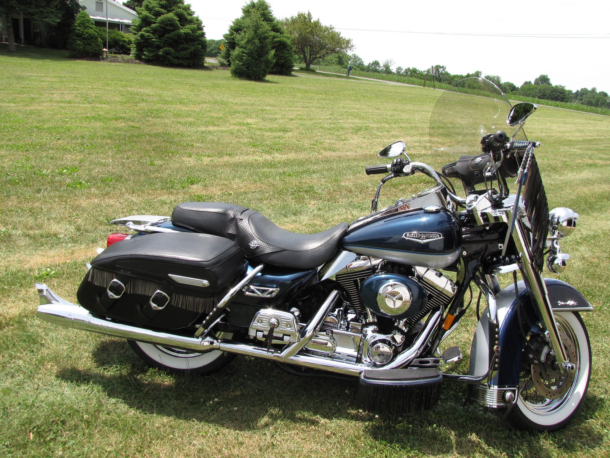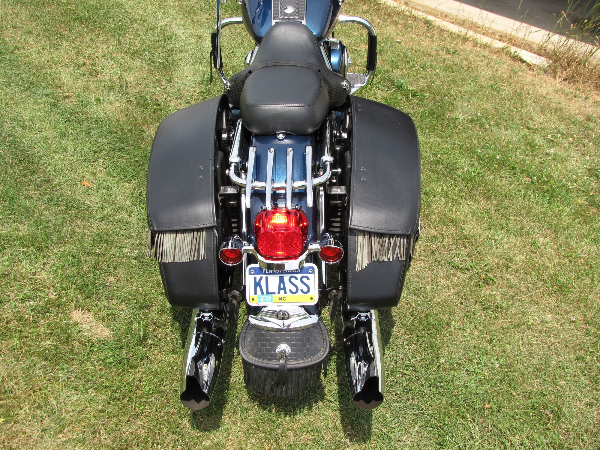 i went with leather fringes to give mine a more nostalgic look. I added fringed 2-tone blue/silver levers that compliment the 2-tone paint scheme, i added an aftermarket windshield that has fringes along the lower sides of the plexiglass, i installed HD fringed floorboard inserts, the engine guard and saddlebag guards have aftermarket leather wraps with a fringe, a rear fender mudflap with fringes from HD, added fringes to the saddlebag lids, screamin' eagle 4" slip-ons with shark fin end caps, teardrop mirrors, and old style grips.