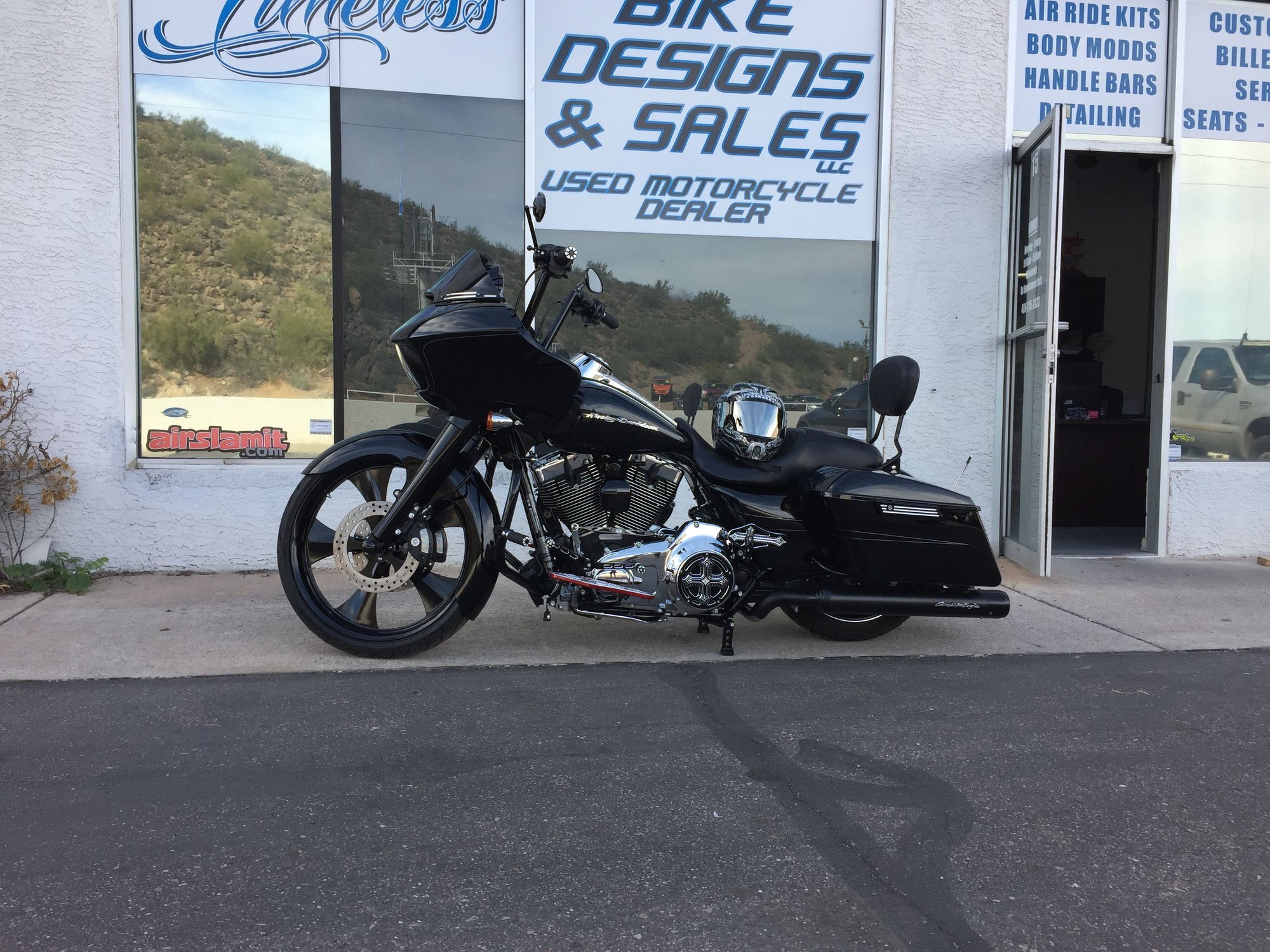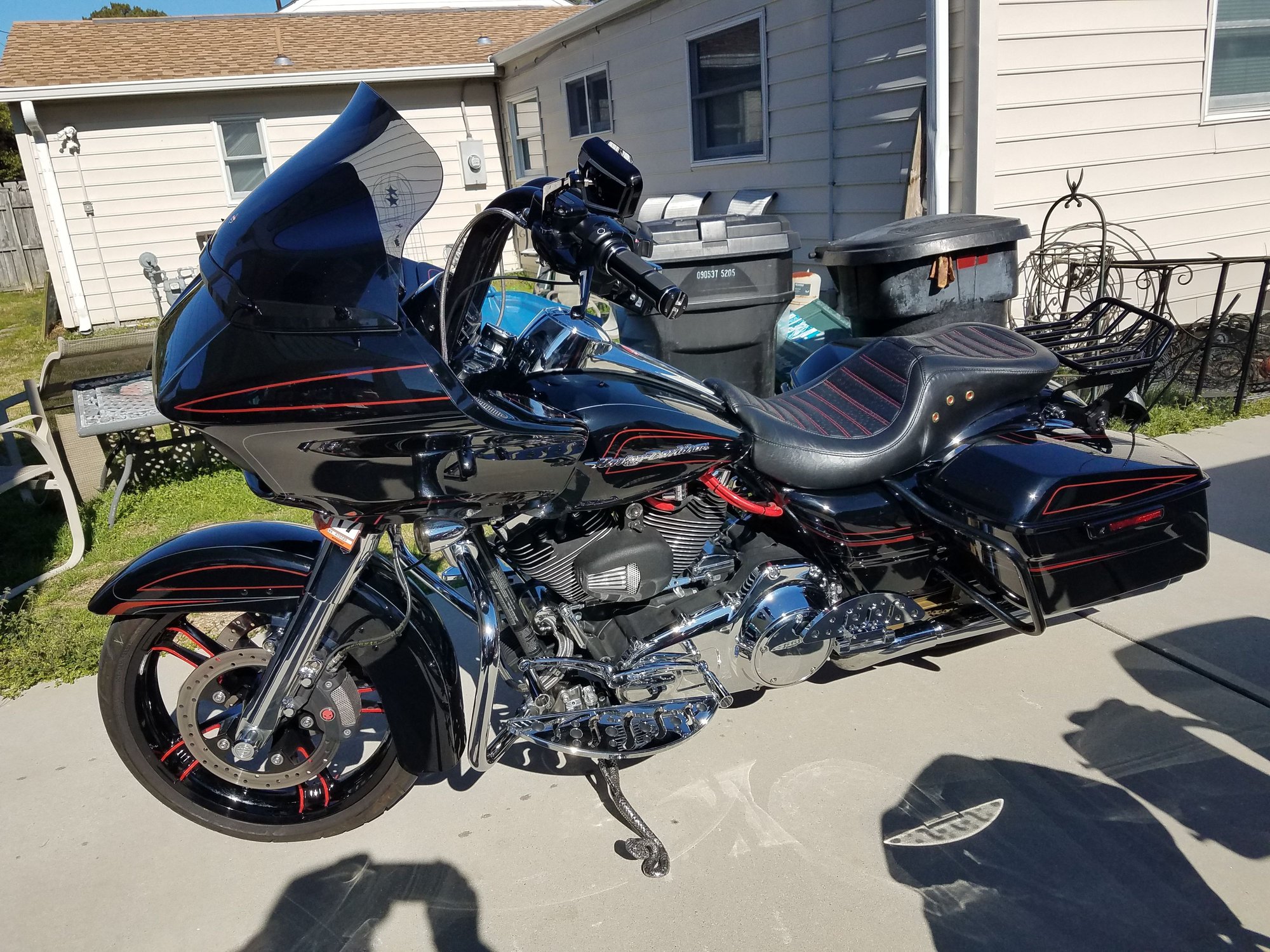 IT has a lot of crazy upgrades, Fullsac "D" X-Pipe, CFRs, PV mounted, 14" Black Apes, Ohlins 2-2 shocks, Ohlins fork inserts, custom made oil lines, custom made 1qt extra holding tank, chain drive, JIMS Forced air induction Fan, custom pinstriping by IGOR, Powdercoated Black/Red Stripe rim, new black grips/handles, black saddlebag guards, C&C SportsTouring saddle w/custom stitch work grips, new chrome shifter arms, pegs, brake arms, pegs, chrome floorboards, chrome BSR pegs, etc, etc.