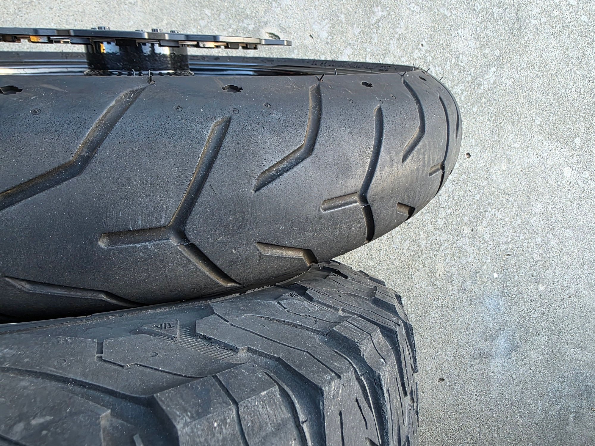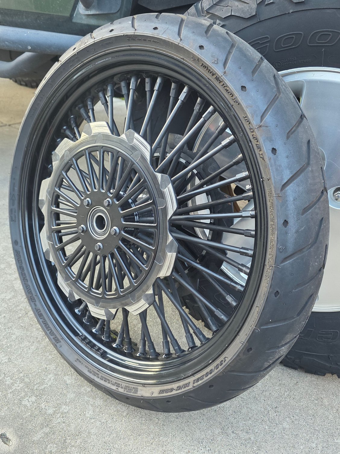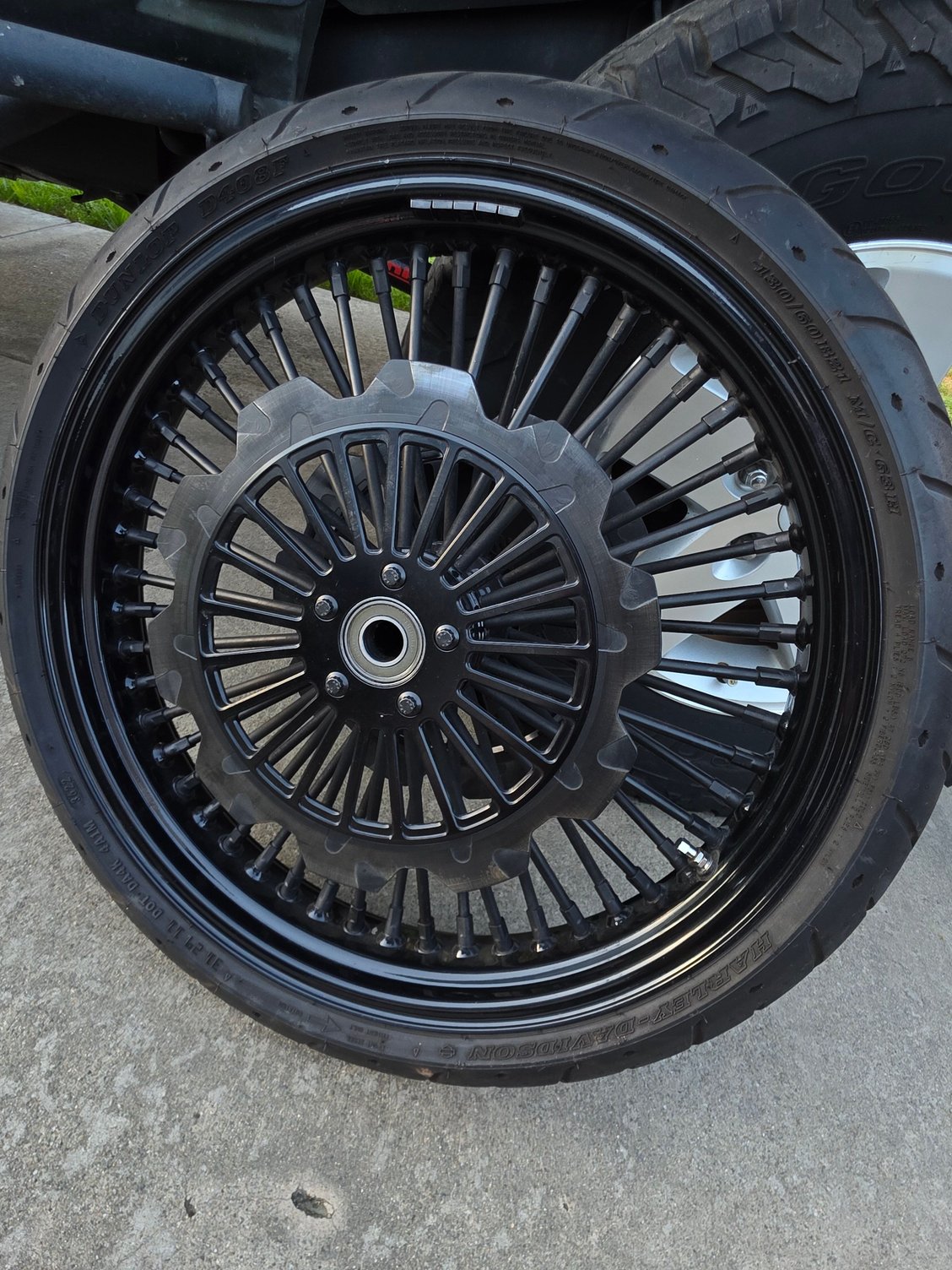 --Front 21" 52-spoke wheel w/dual floating Crown Cut Lyndall 13" rotors. One rotor has slightly more black missing, pad screw up, but feels flat and is really just cosmetic, Both will eventually look the same.( Lyndallbrakes.com). Tire has plenty of tread ( H.D. Dunlop D408F ) 130/60 B21 M/C 63H includes abs bearings w/black weights balanced. ****$1850****
