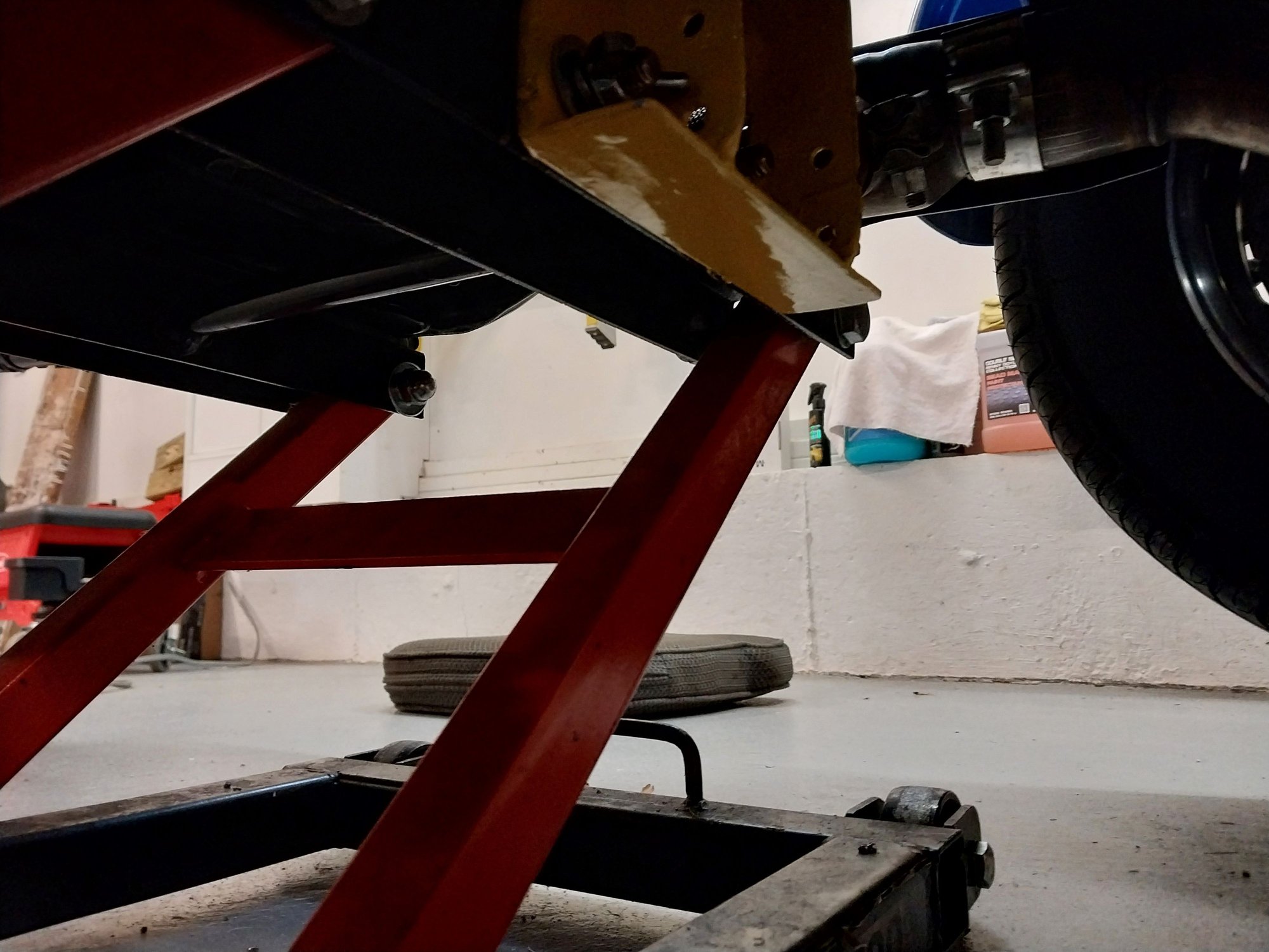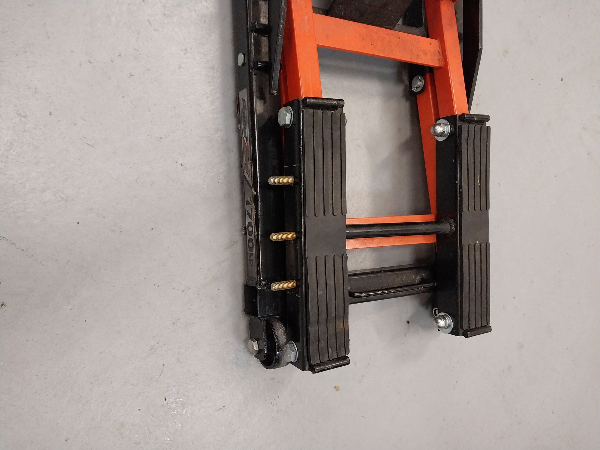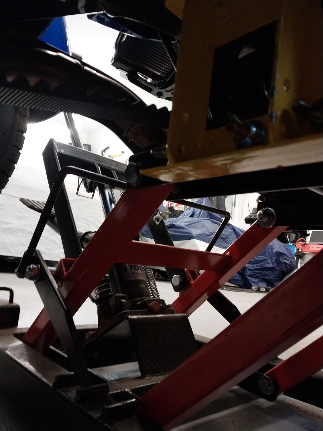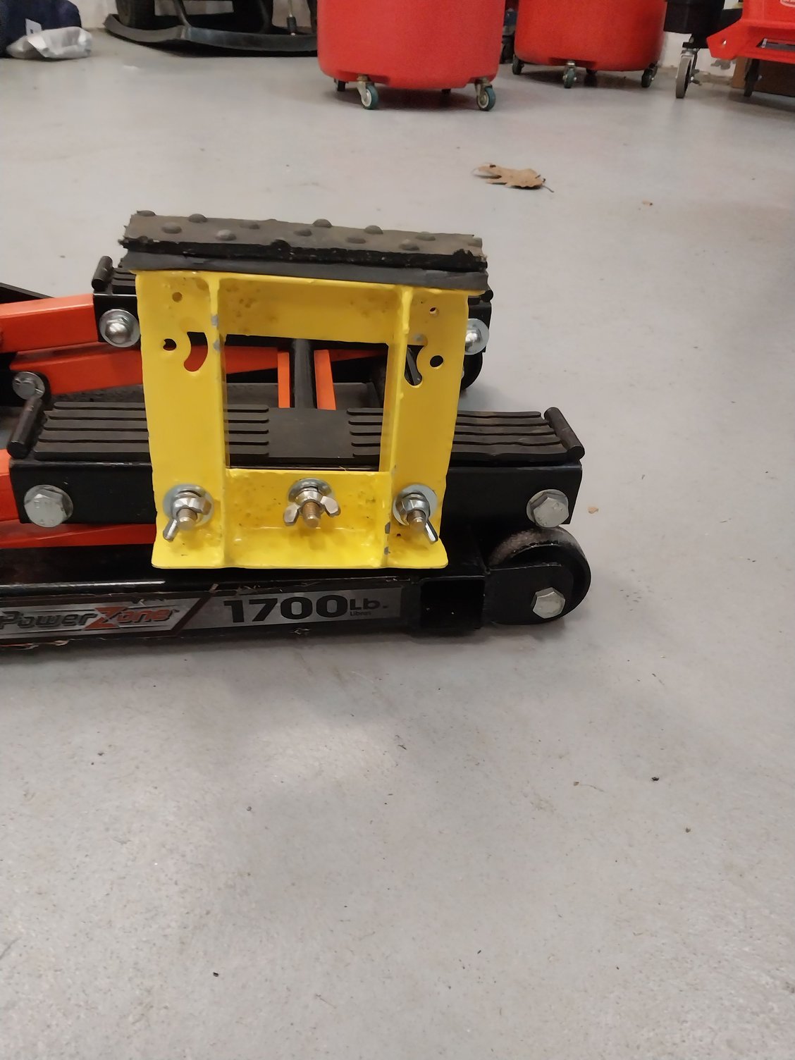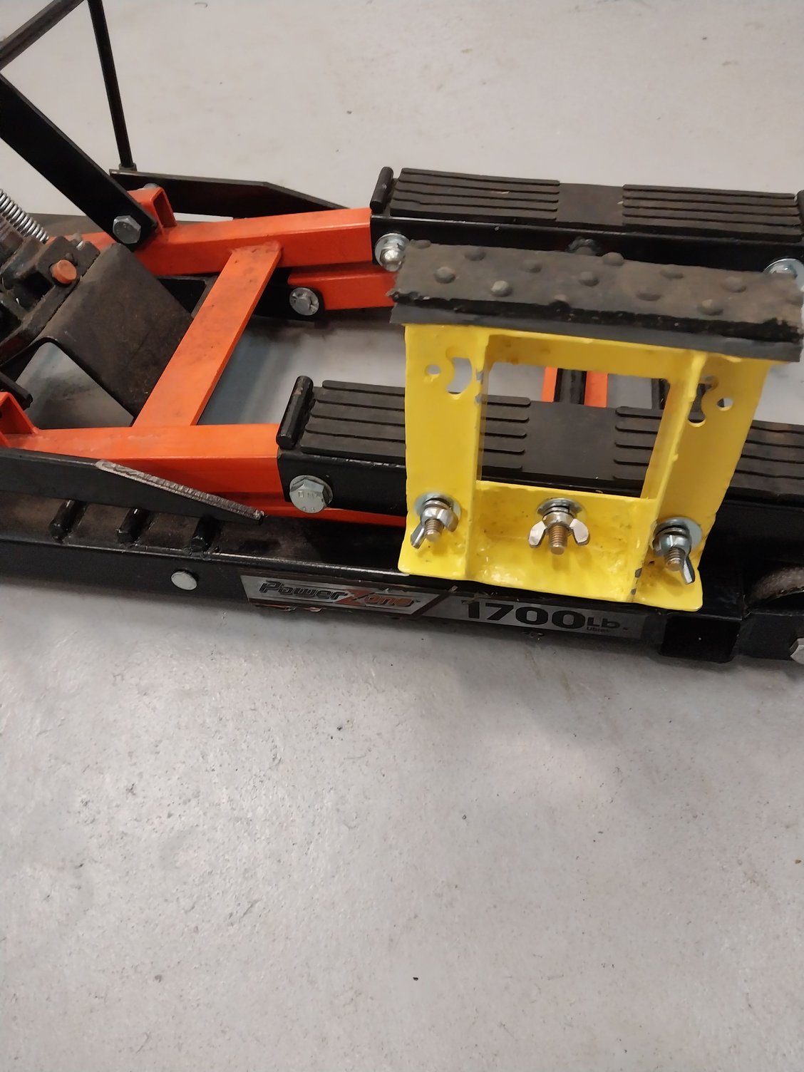 Using a piece of 1 1/2 inch angle iron and 3 grade 8 bolts you can with a little time and a welder create an adapter allowing you to jack up a Harley Tri Glide with a motorcycle jack.