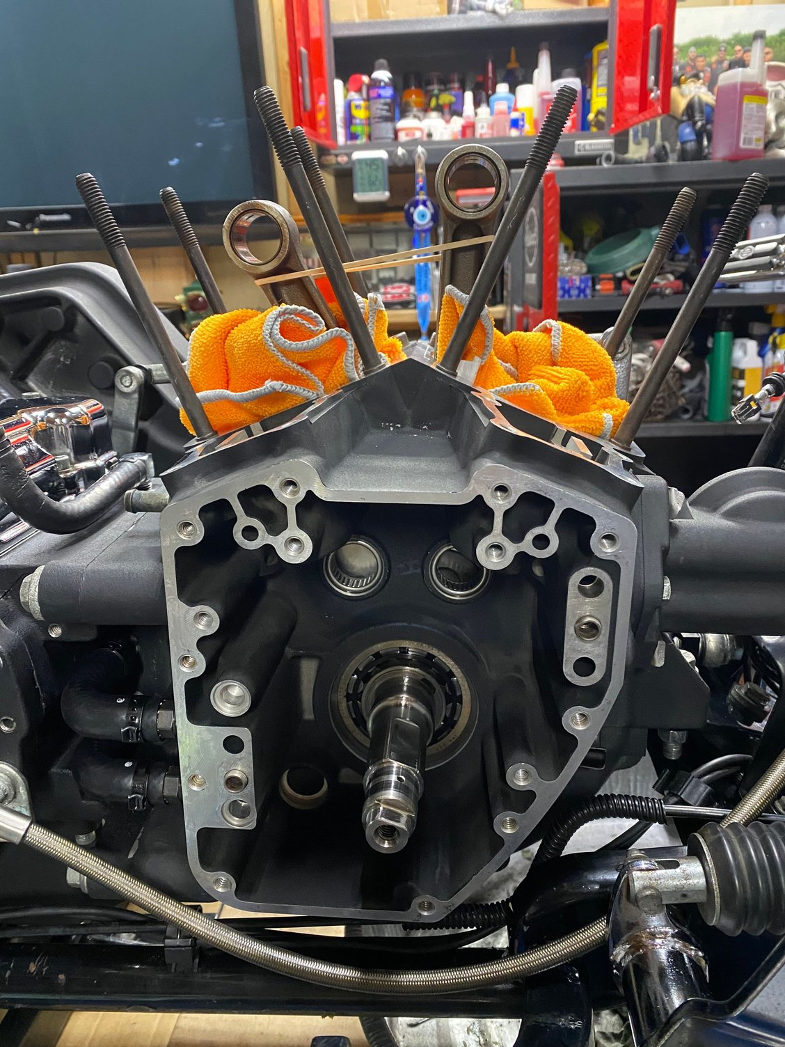 Hey everyone, sorry for the delay but was waiting on parts. Ordered up new S&S piston oilers, one of the stock ones was mucked up good and figured it would be best to get new ones due to the situation. Put the cases back together yesterday and mounted the lower end back into the frame. So far so good, moving along so stay tuned. Here are some pics: