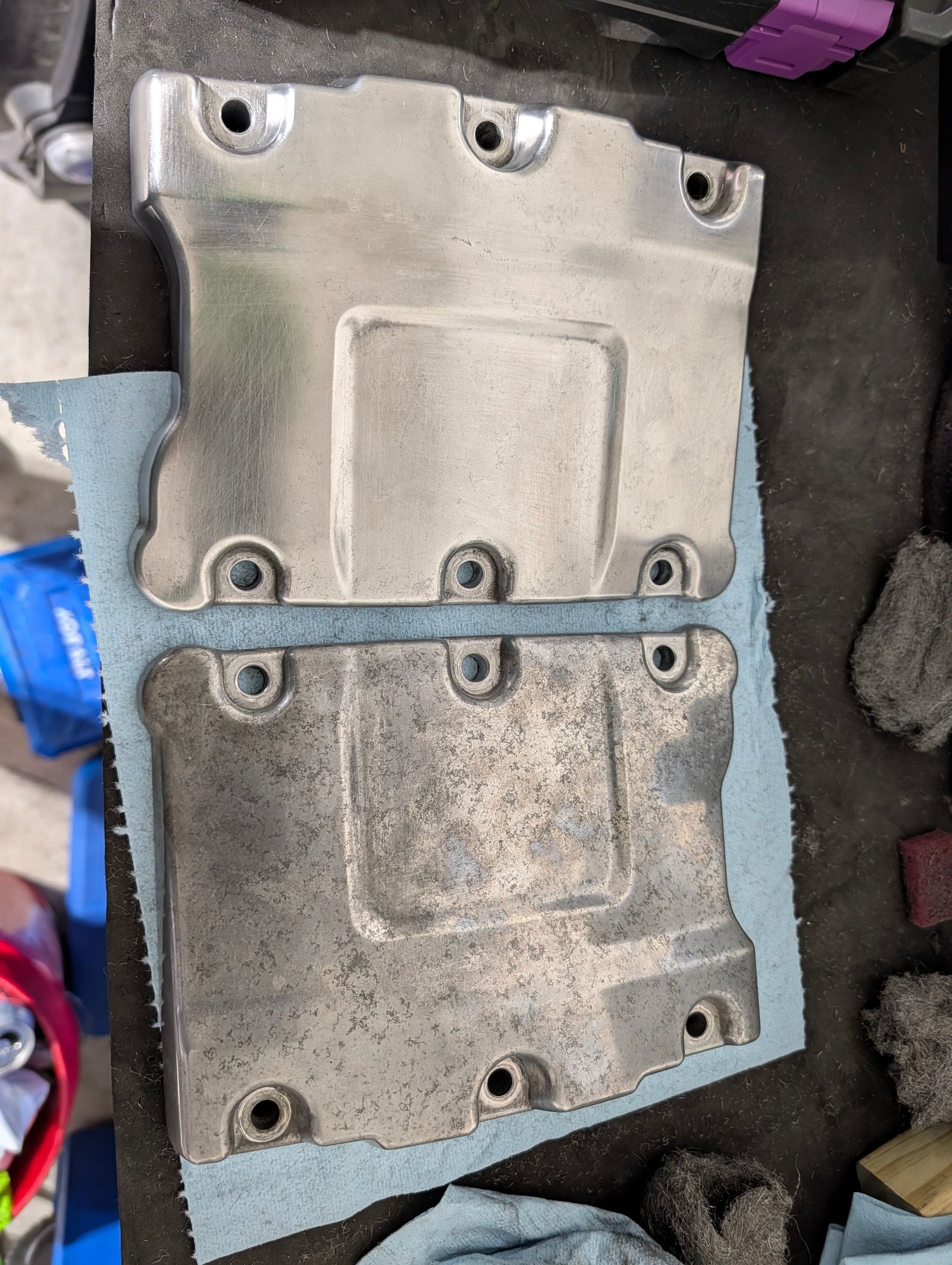 Polishing up the rocker covers, they have a little pitting, mainly heavy oxidation. Picking up some aluminum polish to finish them.