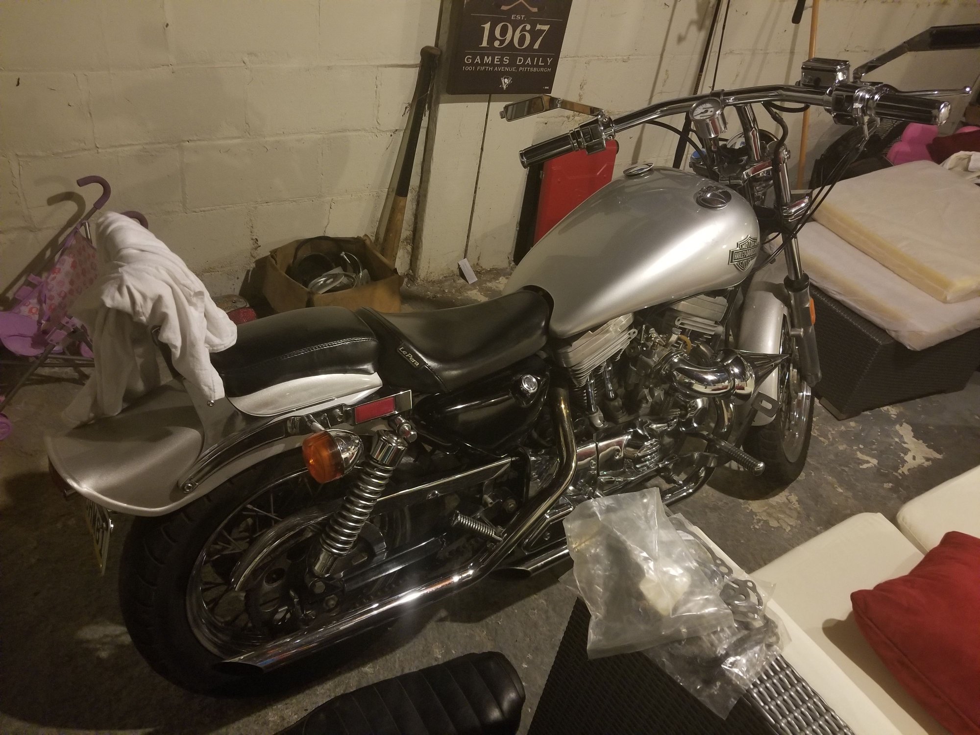 I purchased an 87 Sportster XLH883 that should have a 'big bore kit' making it an 1100? Ran good all the way home. Starts up great. Nice and loud. Not sure what the gas tank is, or the fender, because they do not look stock. This is why I signed up! Want to learn more about the bike and start tinkering with it. Pics are below.