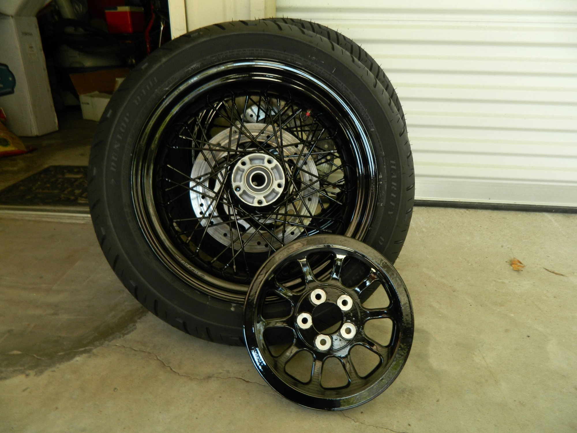 No. I removed the tires, bands, rotors, pulley, and bearings. I check both rims on the trueing stand before having them coated. I installed new bearings and put the rotors on so the new bands, tubes, and tires could be put on and balanced. I took the pictures after bringing them home from having the tires done. Also had the belt guard, floorboards (after taking the pads off), and jiffy stand coated.