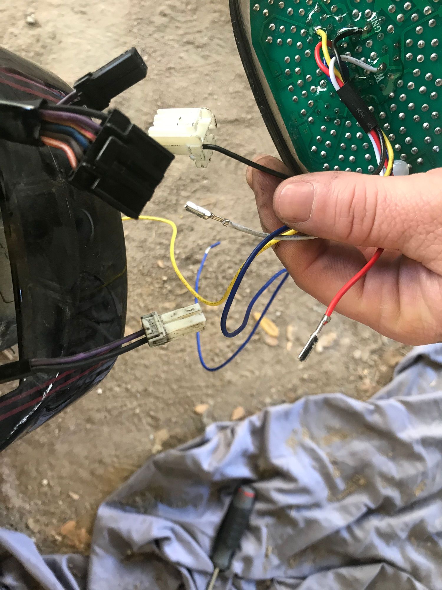 New light. Red is brake light. Blue is left turn. Yellow is right turn. White is running. Black is negative.