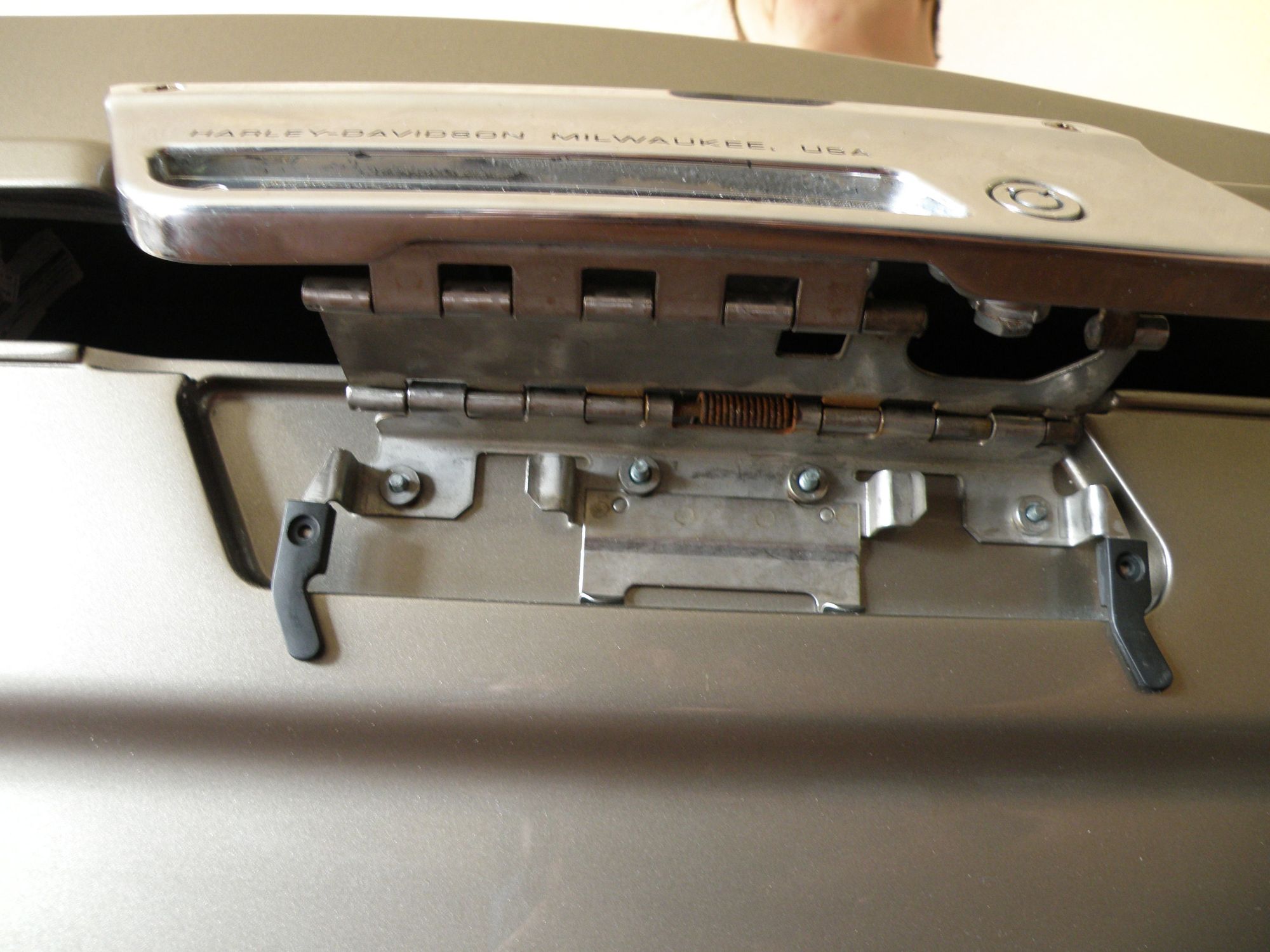 hooked in the back, held up to expose latch