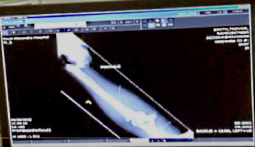 left wrist after repositioning for x-ray 92 minutes after accident. the hand was hanging off my left elbow