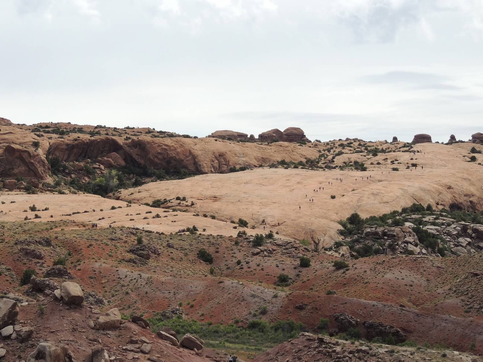 People look like ants walking across the slick rock hill.