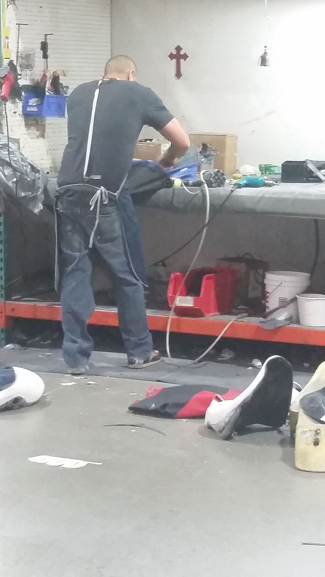 stretching on the foam and stapling onto the hard plastic "frame" of the seat bottom.
