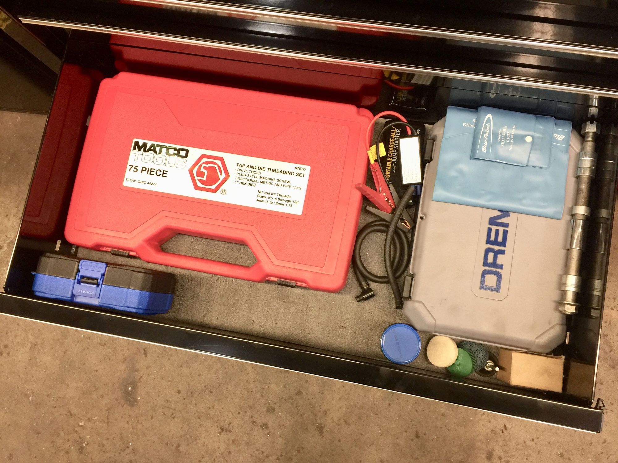 Matco tap and die set along with a dremel. I have an extra axle too that way when bikes with timken bearings come in I can take the wheel off put it on my axle and vise and check end play. Easier when it’s off the bike and you get the same results if you do it like this as long as you follow procedure.