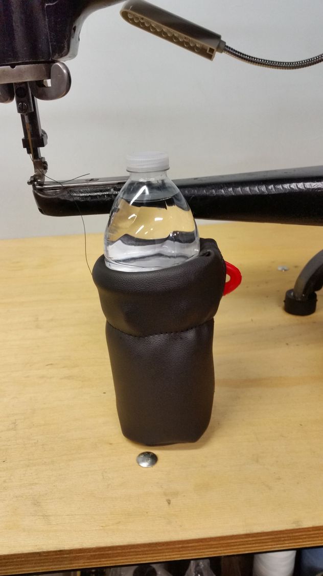 Vinyl placed over the top of cup holder and a seam sewn below it. This will keep the cover from coming off.