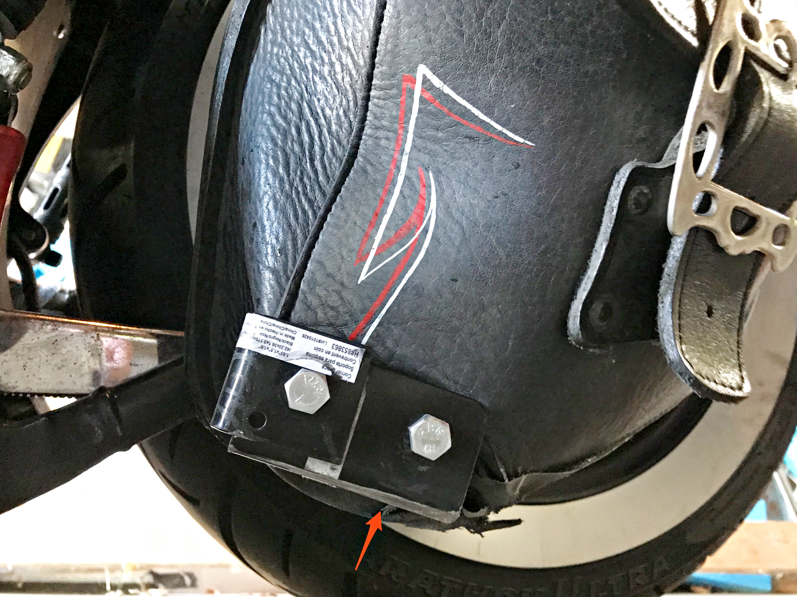 Here are the brackets attached, and after a quick spin on my favourite 80KM/H left hand sweeper dragging everything (that is like 50MpH) , you see the red arrow pointing to them taking the hit instead of the leather.