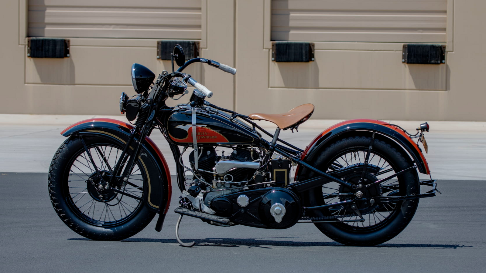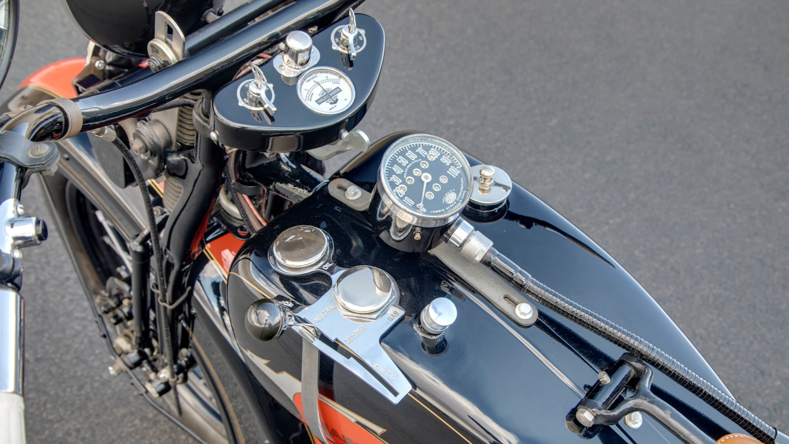 The beautifully restored Harley is a faithful replication of the original. Mandarin Red-and-black paint covers its swoopy lines, which are some of the most beautiful ever imagined by any motorcycle company. And we're glad that this VLD is still around to remind us of that golden, bygone era!