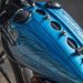 The gas tank is a skillful, but wacky, one-off item. Originally a set of rusted and beat up WL '45' gas and oil tanks, Helverson reworked and joined them to fit the VL frame. Custom mounts locate the tank on the backbone, while the bottom has been notched to clear the Panhead rocker boxes. Keeping it weird, the blue metal flake paint is topped with endless lines on the right and flames on the left.