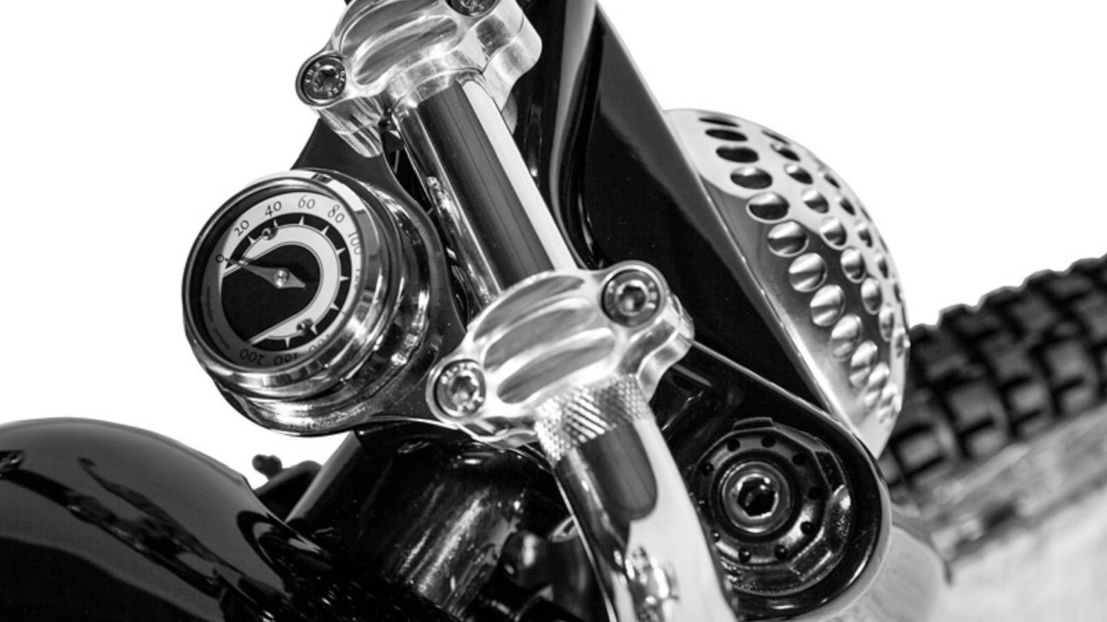 A simple, clean aesthetic is the basic formula for a One Way Machine build. A Motogadget speedometer delivers the speed reading atop an uncluttered triple tree and adjacent to two, basic, chrome handlebar clamps. Up front, the headlight was replaced with an uber-modern, LED array headlight.