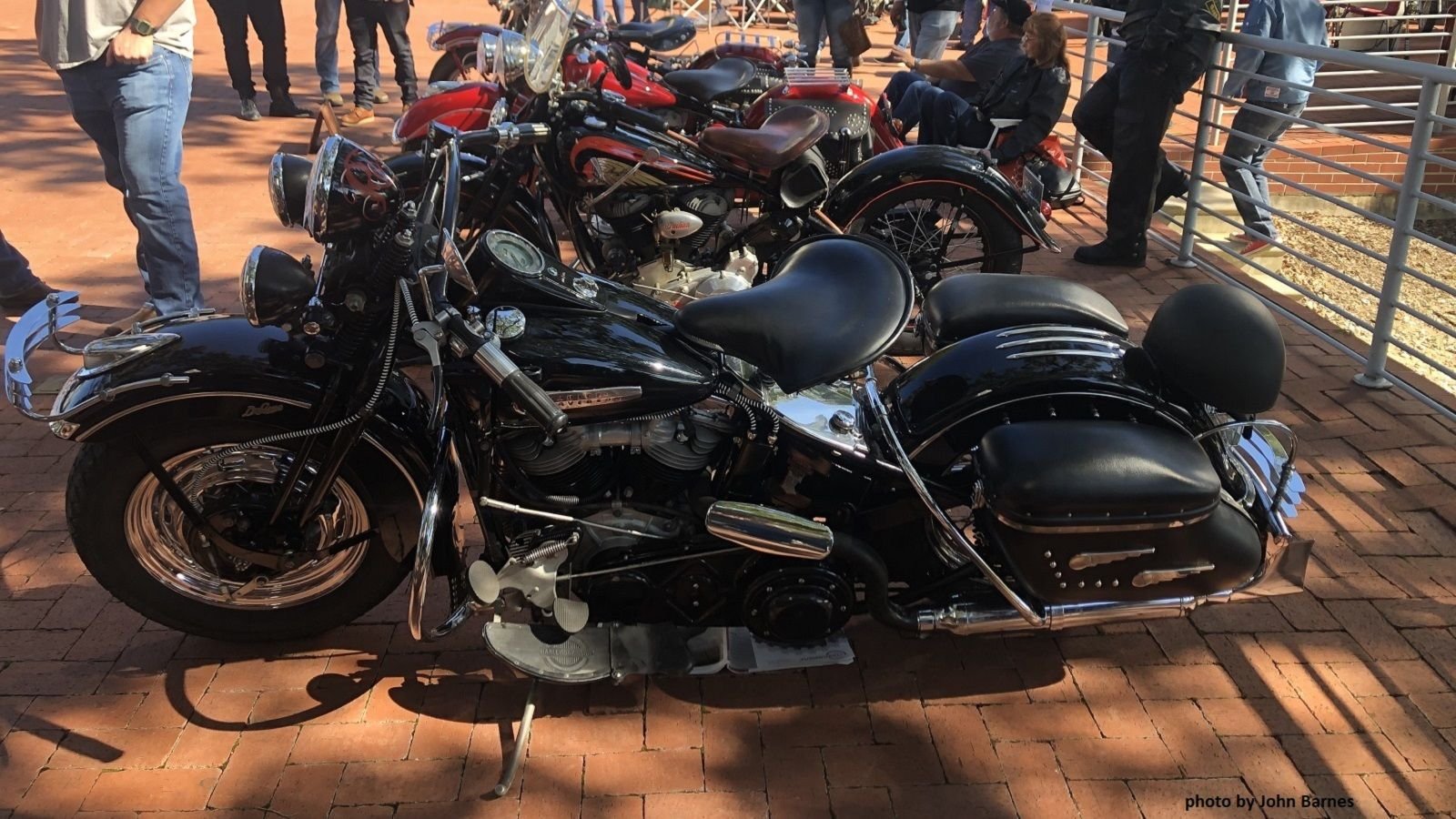 This red Panhead screams America. It's chrome-plated bumpers, racks, guards, fishtail exhaust and Springer forks epitomize American steel of years gone by. Bikes like this Panhead and the Flathead and Indian behind it are becoming increasingly rare. Before long, these vintage shows will be dominated by Ironheads, Evolutions, and Twincams.