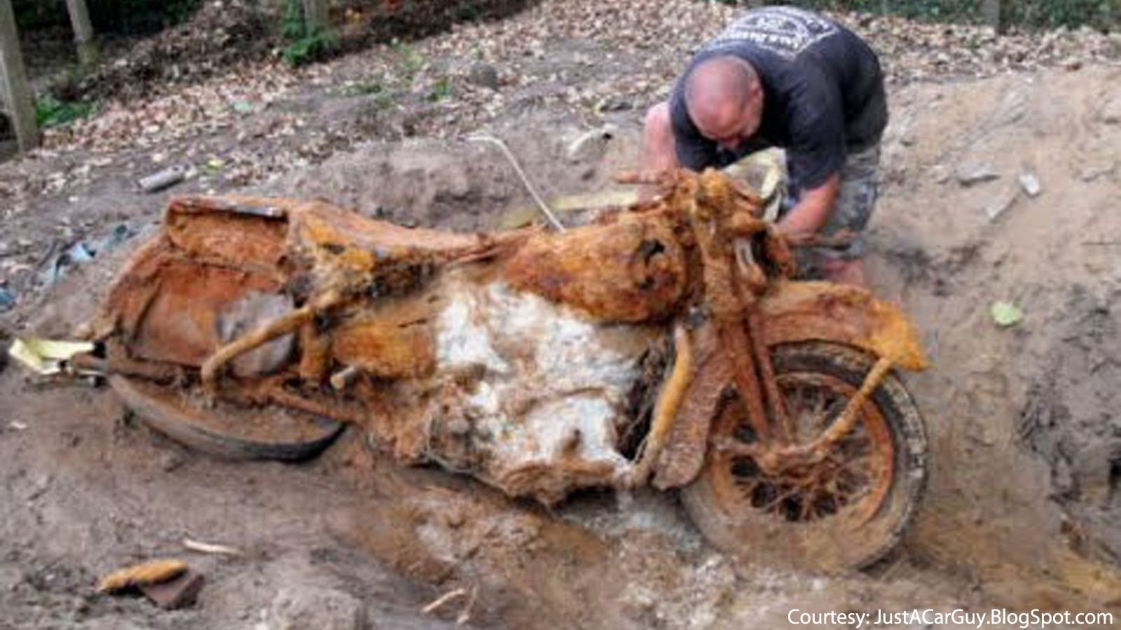 After crashing his Harley-Davidson, a young man in Belgium left it abandoned in his backyard. Long and forgotten, he started a family and his daughter, playing around with it, fell off of it. She must have hurt herself badly because this caused the father to dump it in a buried well out of anger. It wasn't until 2009 that his grandson gained permission to unearth it from its rusted slumber. For more on the story and images of the buried Harley-Davidson click here.