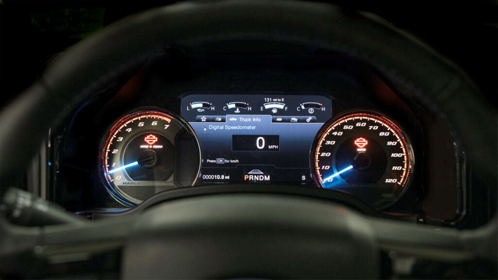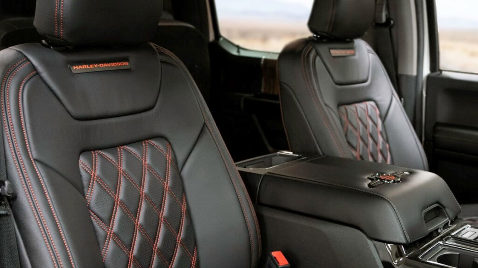 On the inside, you'll find custom leather seats with with diamond-stitched center sections and orange accents. Not to mention Harley-Davidson branding everywhere, including the gauge cluster, center console, floor mats, door sills, and billet aluminum pedals. Every Harley-Davidson truck produced is also assigned a limited edition number, which is placed onto the center console in a prominent way.