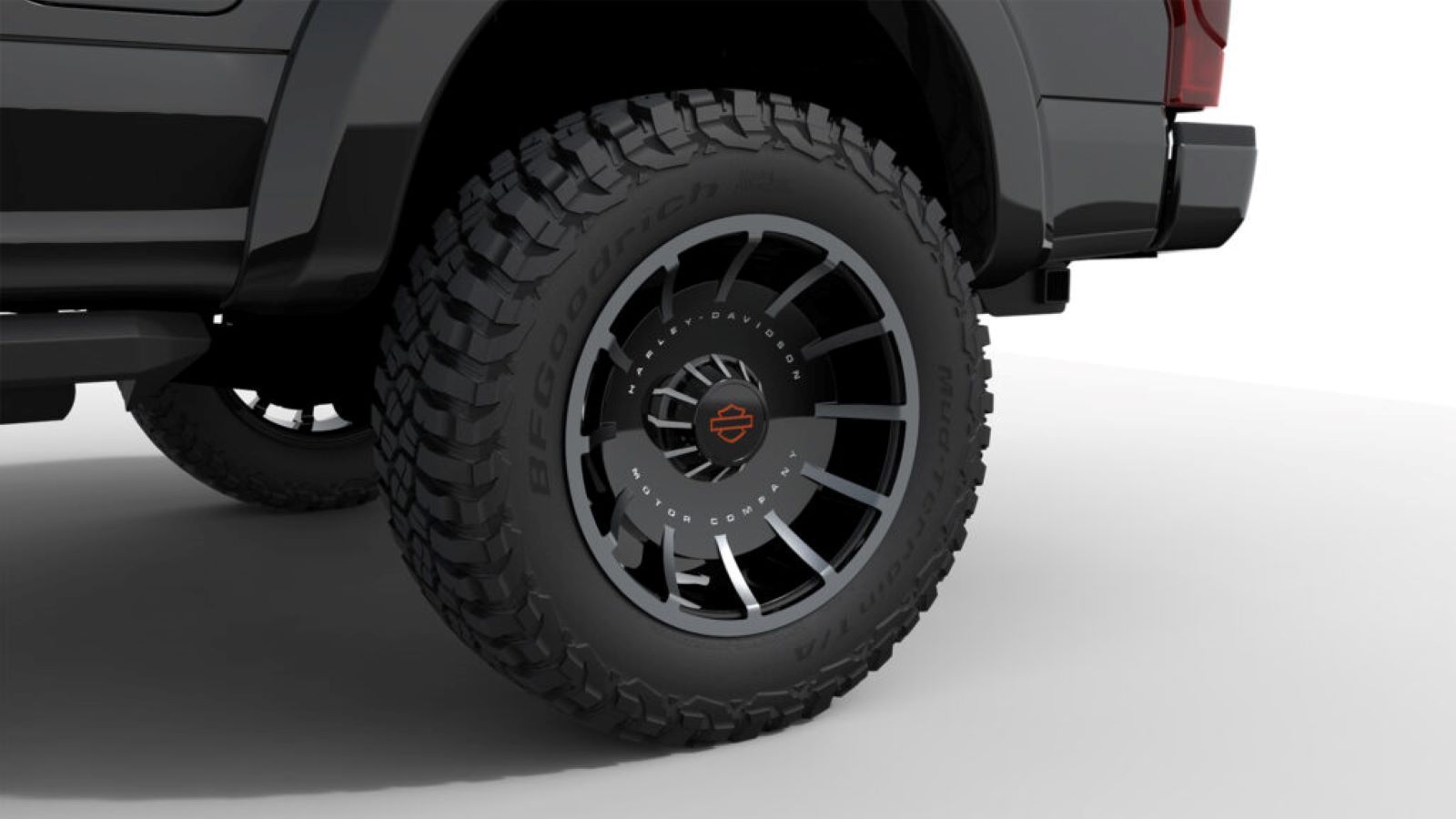 The unique 22" wheels on the F-250 Harley-Davidson were inspired by the Harley's iconic Fat Boy and CVO motorcycles. They feature vivid orange logos and "Harley-Davidson Motor Company" script milled into the face of the wheel. The attractive hoops are then wrapped in aggressive 37" BFGoodrich KM3 tires.