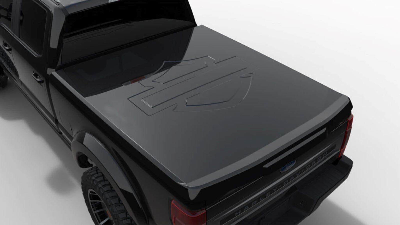 The color-matched hard tonneau cover on the H-D F-250 features a Bar & Shield logo that's debossed onto the top of the cover. On the sides, you'll find fender vents with raised orange and dark finish perimeter accents and the Bar & Shield logo, too. The finishing touch is a set of solid aluminum black exhaust tips with orange accents.