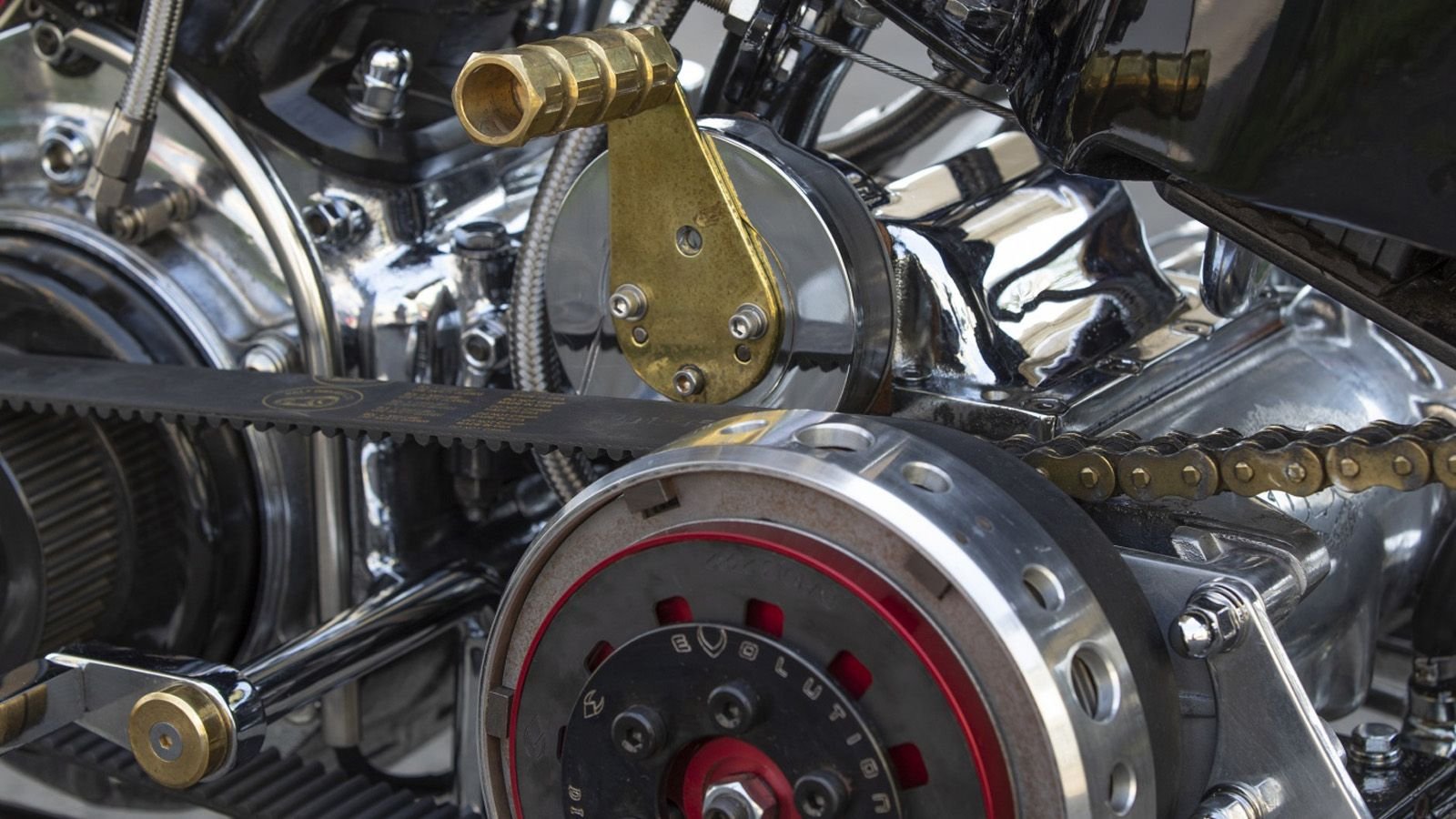 The rocker boxes were split and chromed. Sometimes the source of controversy, the process of machining out the rocker's centers is purely a cosmetic touch. The cases were also treated to the shiny bath and the transmission received a polish. The flywheels were balanced, and the motor was fitted with reworked ZEL cylinders, from the 1970s aftermarket supplier, Zodiac Enterprises Limited.
