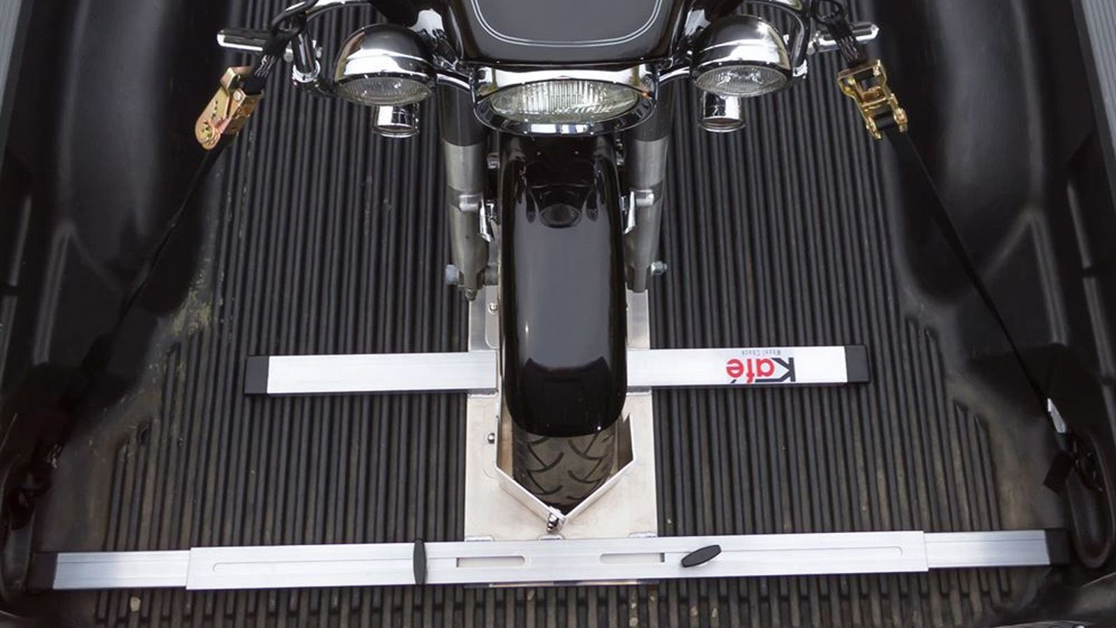 Secure the motorcycle with ratchet straps from either the top triple tree or the fork stanchions. Fastening at the fork stanchions allows the suspension to absorb bumps along the way. Secure the rear of the bike in the same manner from ridge points on the frame. It is a bad idea to hook onto the thin metal of the bed rail. D-Rings, or similar, are required in the truck bed.
