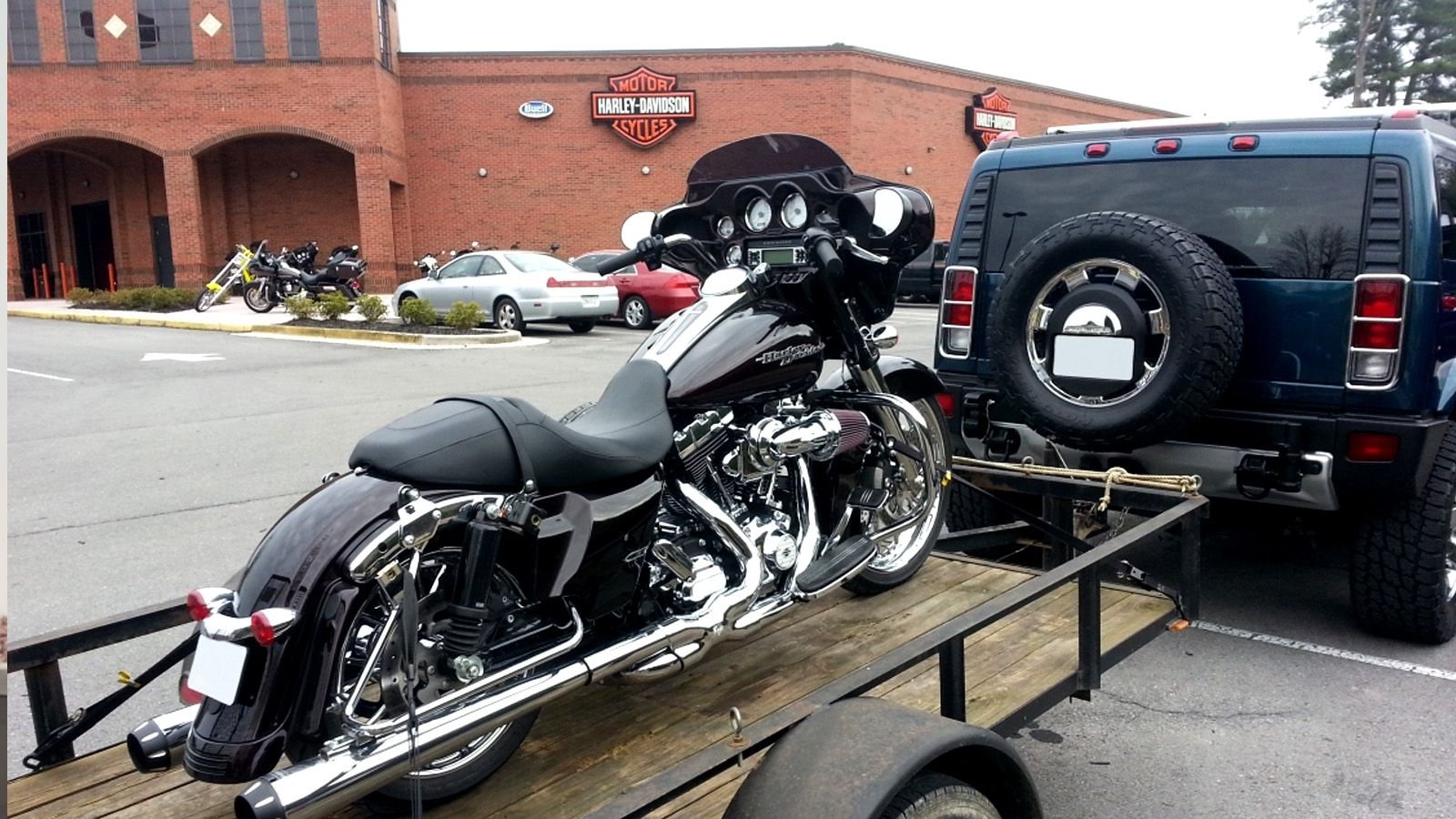 Using a trailer is an ideal method to haul around one's prize chopper. The main drawback to trailering is that it requires a vehicle set-up for towing. Be warned, an improperly matched tow-hitch or lack of signal wiring can be disastrous, not to mention the potential for costly fines from local law-enforcement.