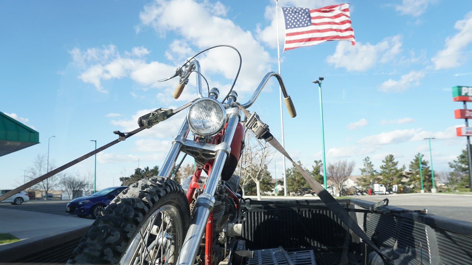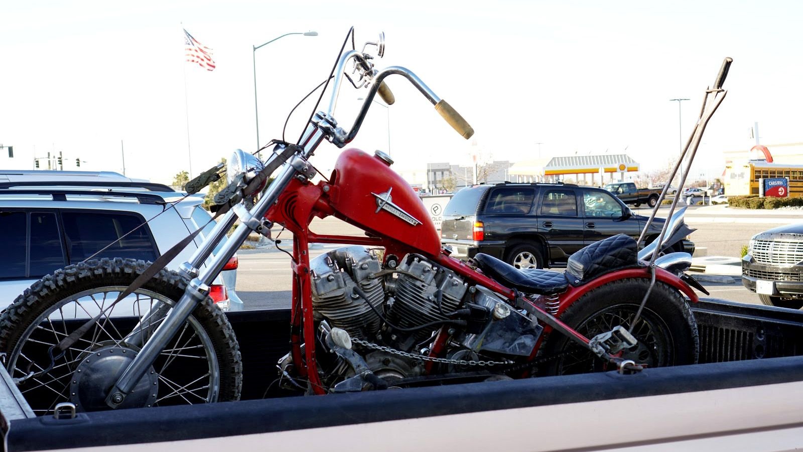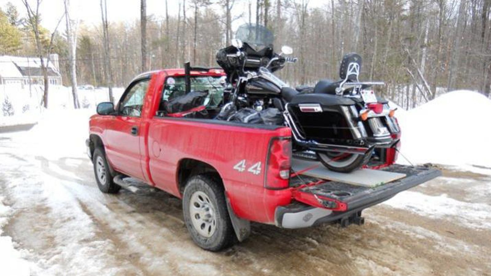 A quick re-cap. For truck hauling one needs: four good-quality ratchet straps, D-Rings or tie-down points, a set of ramps, another couple ratchet straps to secure the ramps, and a helper. Note that long bikes can bottom-out on the front frame loops where the ramps meet the tailgate. [Photo: sbstreetmachines]