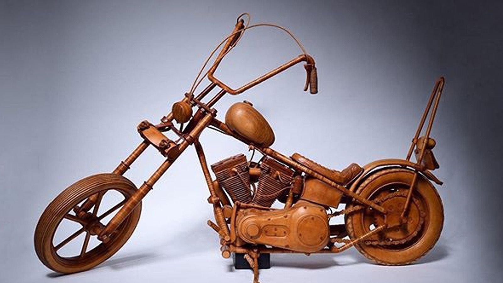 In the category of 'labor of love' was a three-quarter scale Harley-Davidson chopper made entirely from leather. From the wheels to the frame to the headlight, every item was leather — even the tools in the leather tool bag. Made in 2000 by twenty craftspeople at Red Moon, a Japanese company specializing in leather goods, the project took more than two years to complete.