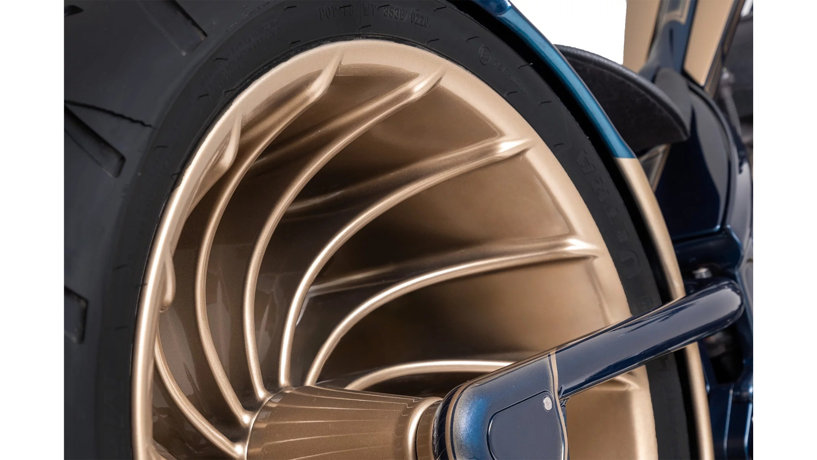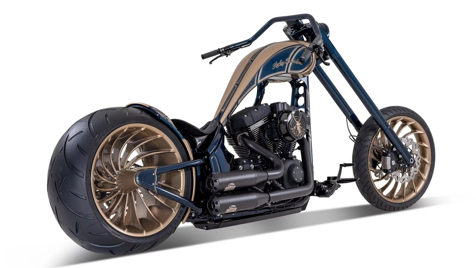 Despite the dramatic structural changes, the motorcycle retains the Softail’s original engine. The powertrain breathes through a custom intake from Bundnerbike and an exhaust system supplied by Dr. Jekill & Mr. Hyde. The wheels themselves are machined from a single block of aluminum, emphasizing the handcrafted nature of the project.