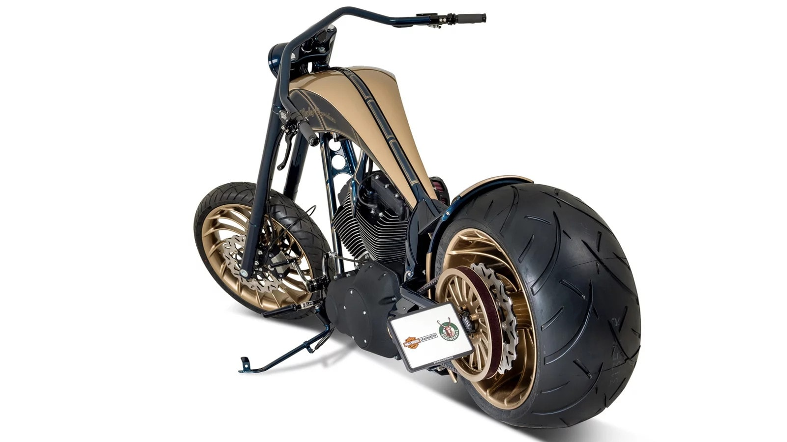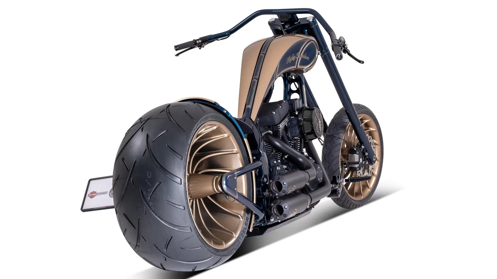 Transforming the Softail required major structural changes. Bundnerbike extended the motorcycle’s frame by about 10 inches (25 cm), significantly increasing the overall length. That stretched profile is accentuated by a very low seating position and a rear wheel measuring 18 inches wide, which visually dominates the back of the bike.