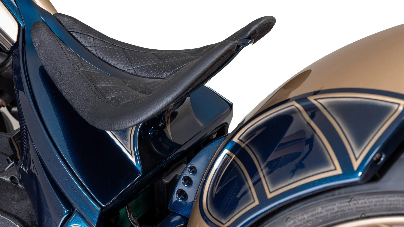 Several aftermarket components help complete the build. Parts supplier Performance Machine provided items such as the brake and clutch levers along with the footrests. At the rear, the fender integrates lighting elements—an approach commonly seen on heavily customized Harley builds.