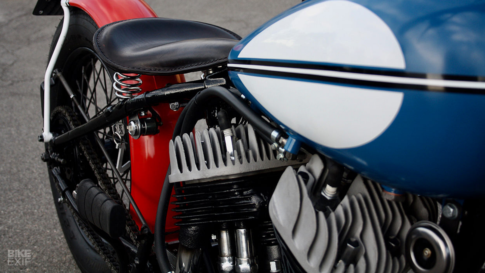 Capped off with a unique red, white, and blue paint job, this old Harley is a home run in our book. But as Roper-Caldbeck explains, the custom bike world isn't always that simple. “Building custom bikes is always fun. It’s like playing Russian Roulette: you never know if you’re going to get the pay or the bullet.” And after hitting paydirt twenty-five consecutive times, we suppose you can't blame him for giving it up!