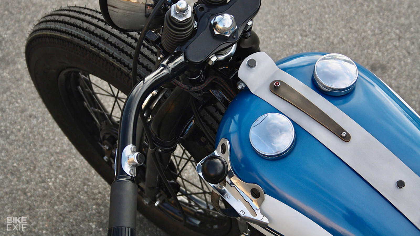 To make space for that battery, WR-style gas tanks were sourced. The pair were tied together with a custom aluminum strip, which also houses a piece of brass and an oil pressure light. It's surrounded by Speedster bars that have been chopped six inches and Parkerized like most firearms.