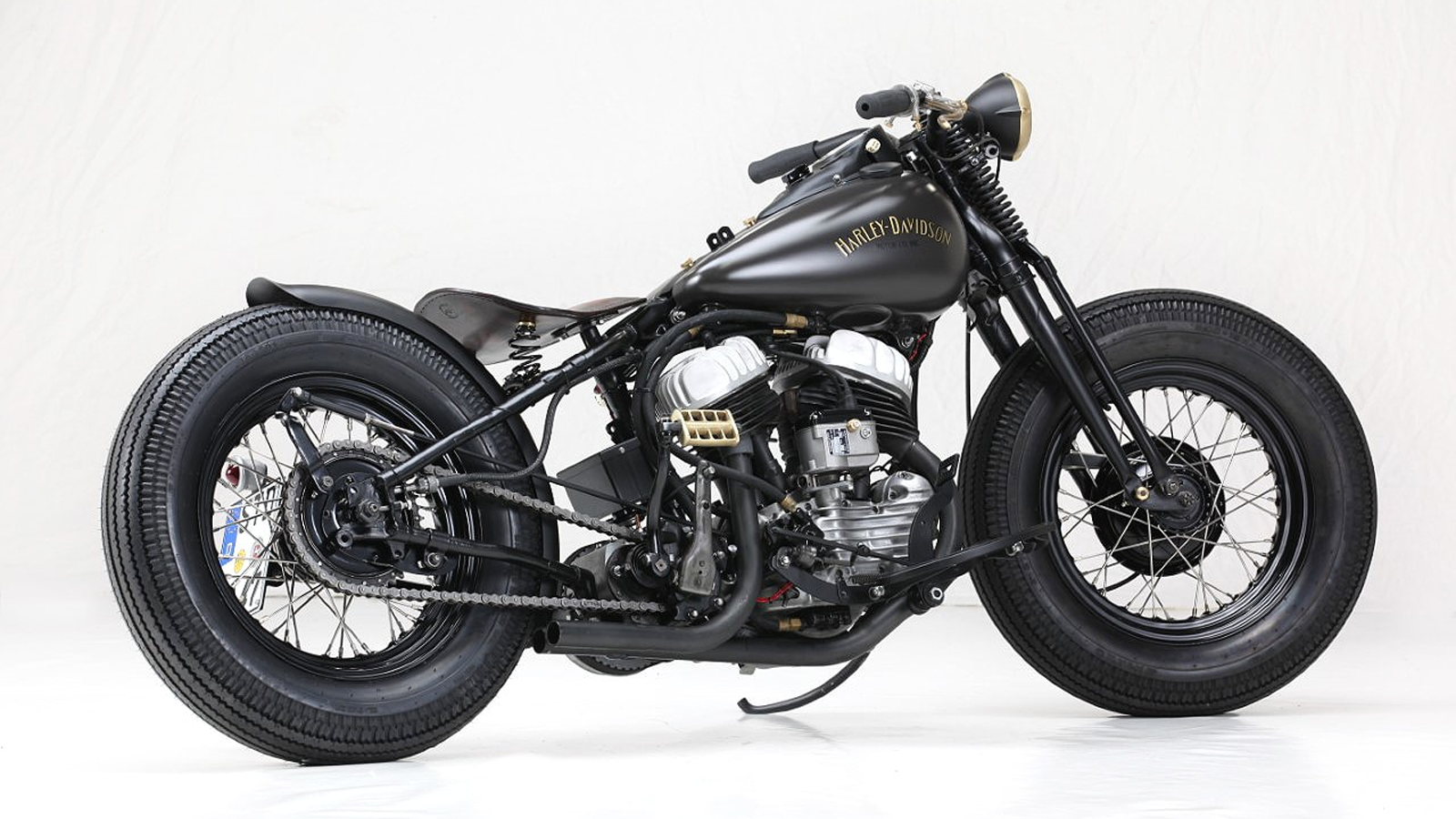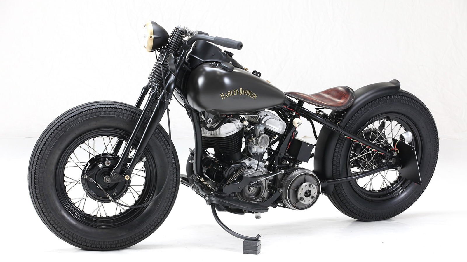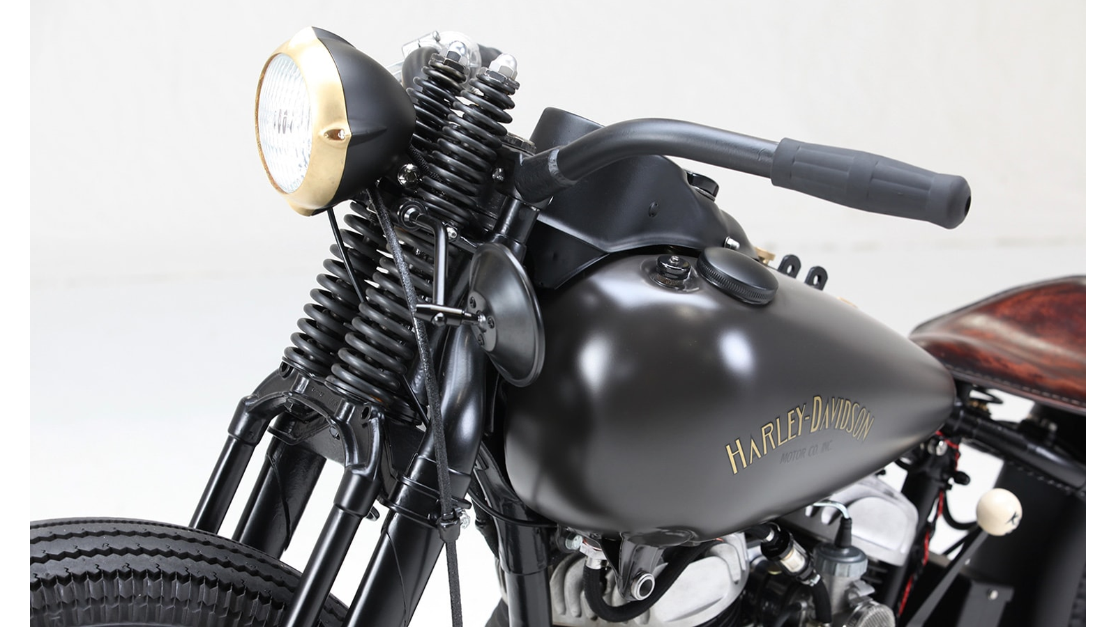 A custom bobber-style seat was created by Spirit Leather, featuring premium brown leather and supported by springs for a classic yet comfortable ride. The fuel tank and rear fender were also overhauled, with Stephan opting to send the bodywork for a professional paint job. The result was a sleek flat black finish complemented by gold decals and bronze accents, including a beautifully ringed headlight. Stephan’s attention to detail ensured the bike's overall aesthetic was as impressive as its mechanical prowess.