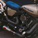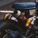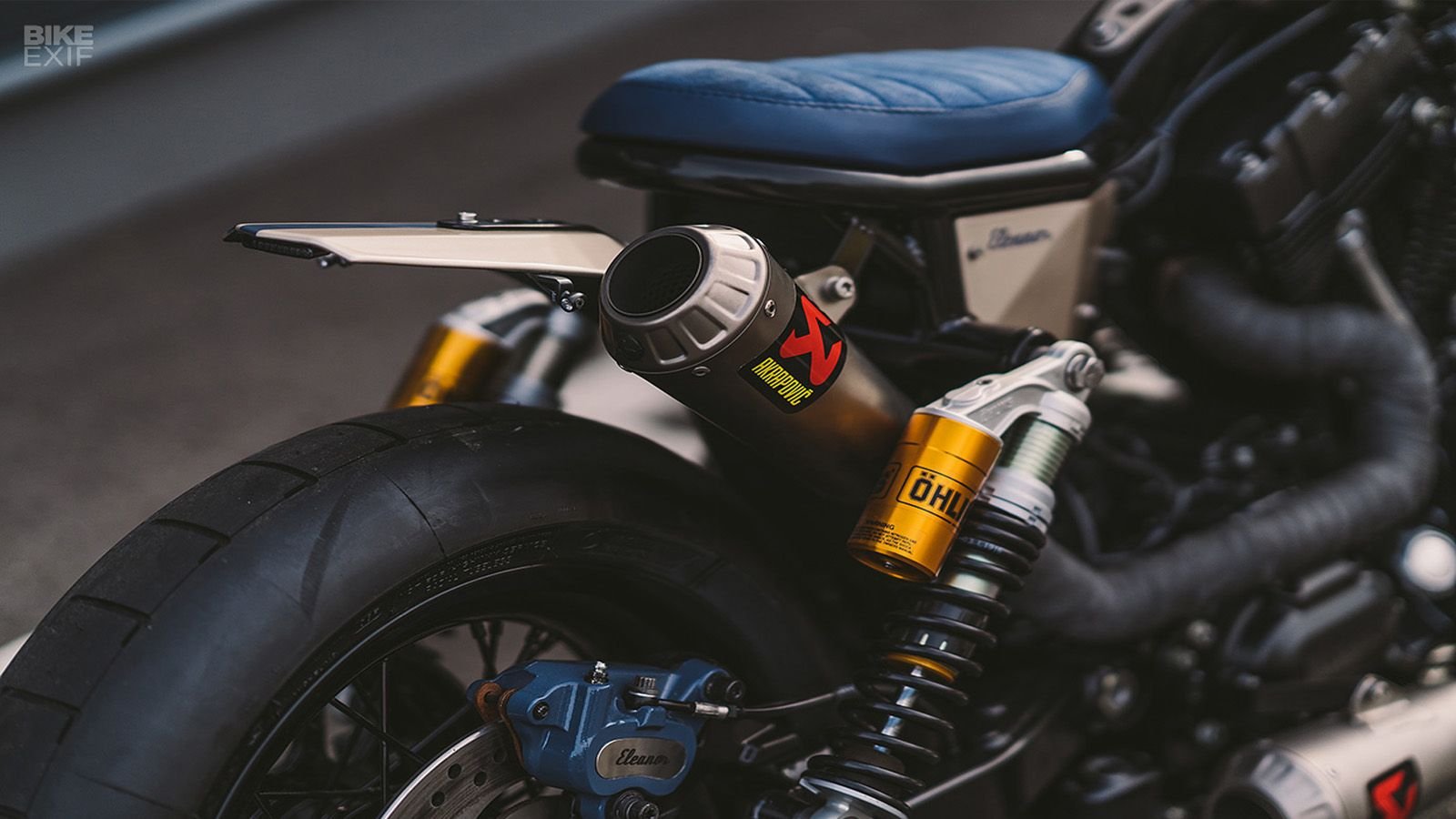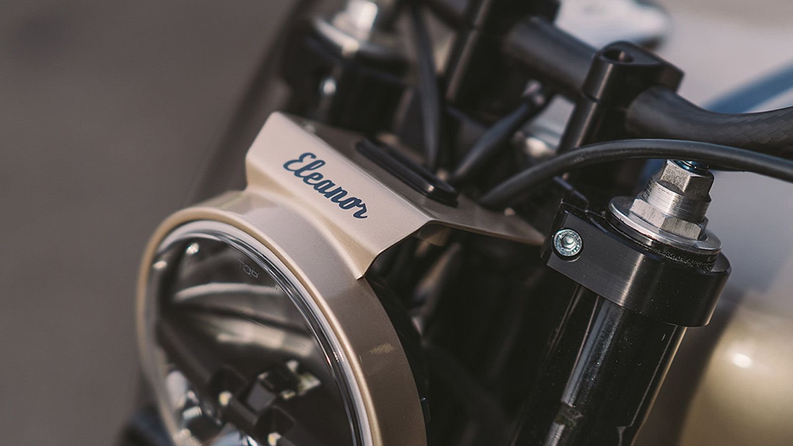 The bike first made the journey from sunny California to the workshop in Feldkirchen where it was stripped right down to the bones. Out went the engine and heavy modifications started to take place at the rear of the frame by shop fabricator Manuel Tike. The subframe of the bike now has just enough to support the blue leather solo seat that matches the matching blue logo on the tank, striping, and brake calipers. Speaking of the brakes, the front caliper is Brembo while the rear is a two-piston branded with the "Eleanor" signature.