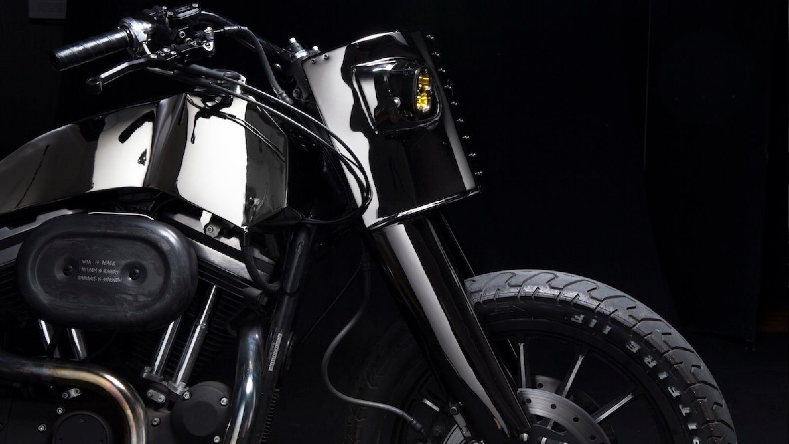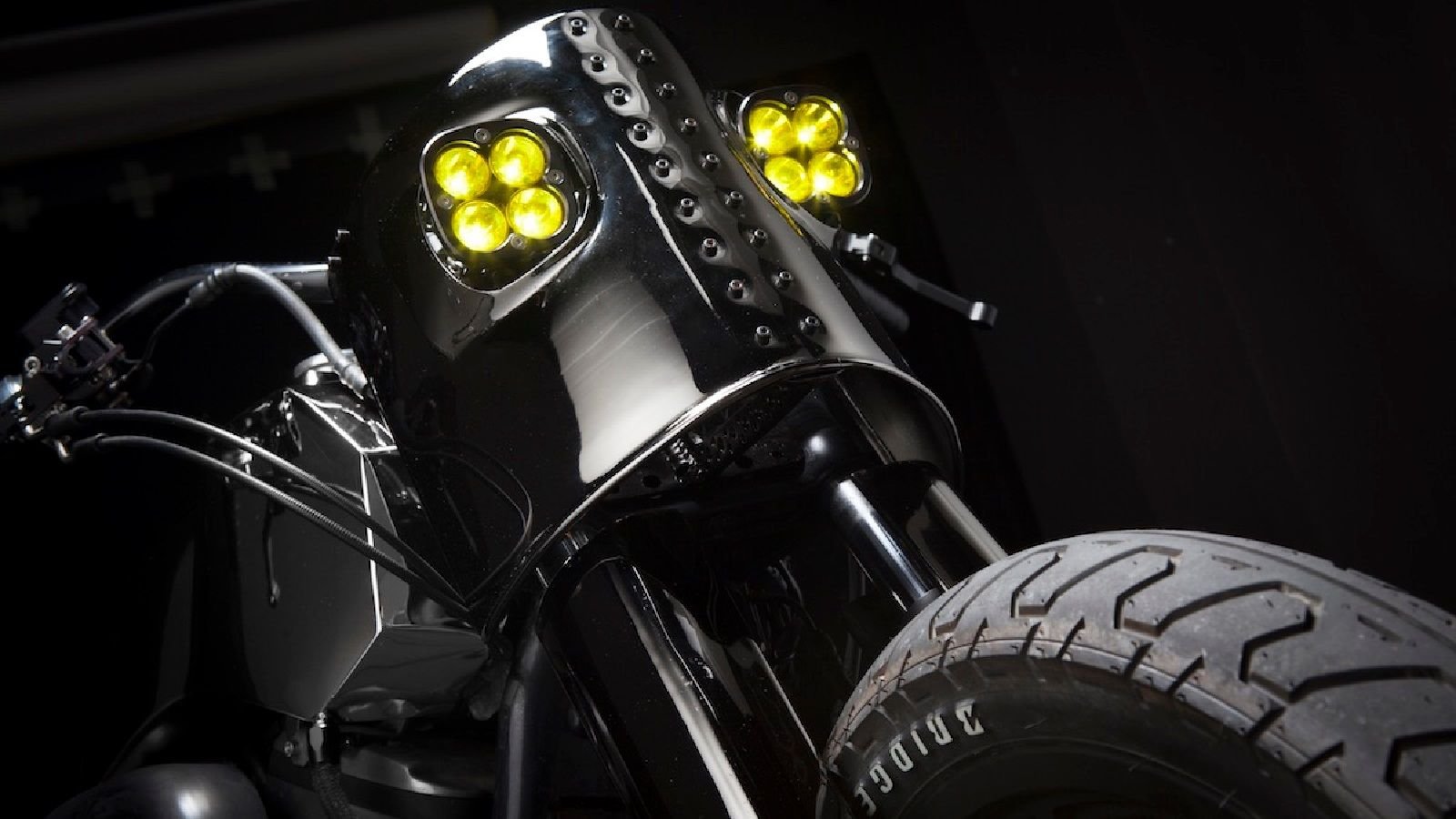 The motorcycle before us is based on a 2003 Harley-Davidson Sportster 1200, but has undergone some extensive changes to give it a futuristic, yet medieval look. Coined "Malo/Bueno" (Bad/Good), the bike is supposed to represent a fierce creature that looks menacing from afar, but can be gentle and loving when handled with care. The most polarizing feature of the bike is the headlight/fairing assembly that sits above atop the custom fork leg covers to give the bike a robotic look. The Baja Designs LED headlights poke through this hand-hammered and riveted piece of metalwork like eyes peering through a mask.