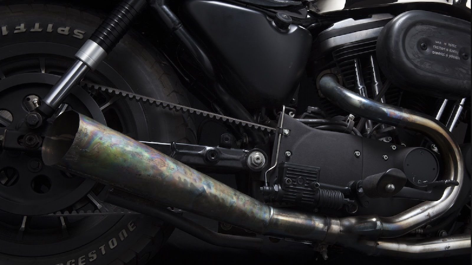The exhaust is said to be a modified 2-into-1 Screamin' Eagle unit, but has a very interesting rainbow patina on the stainless muffler and head pipes. The muffler looks to be a straight megaphone, so this thing can scream! The bike has been fitted with a dual disc brake setup for more stopping power than the original single disc arrangement. Bridgestone Spitfire 11R tires with raised white lettering look retro but provide the go-anywhere ability of modern touring tires. Not an ounce of chrome is left on the bike as it has all been blacked-out. The bike can be considered a bobber of sorts as all unnecessary components such as the battery cover or belt guard have been tossed away.