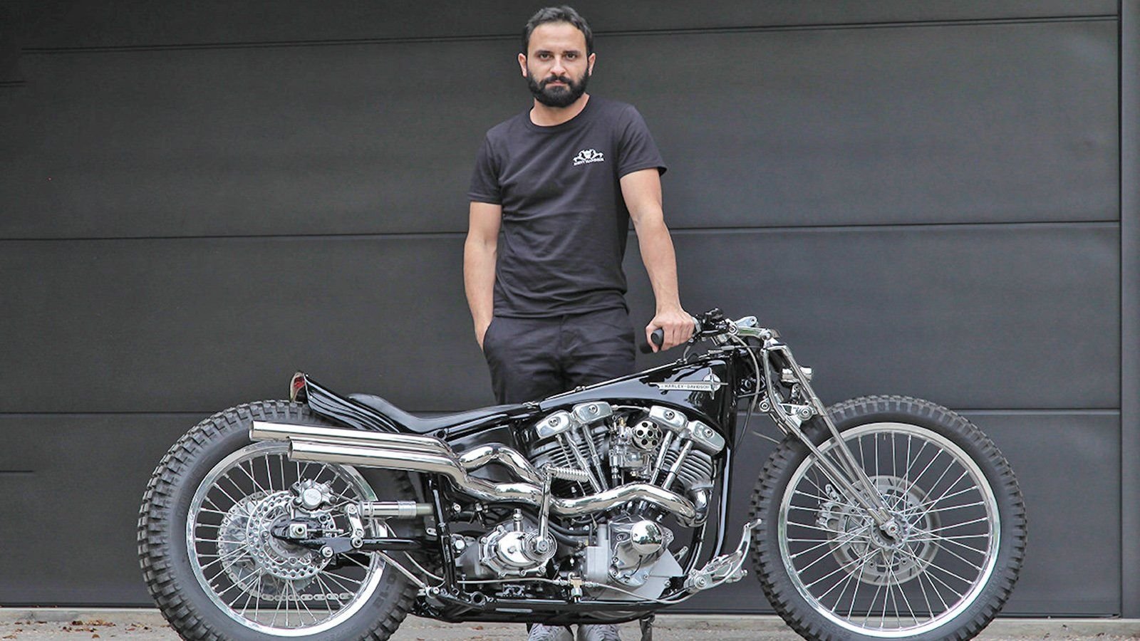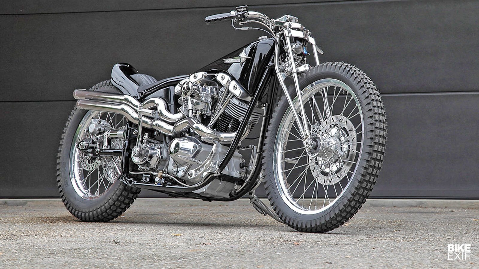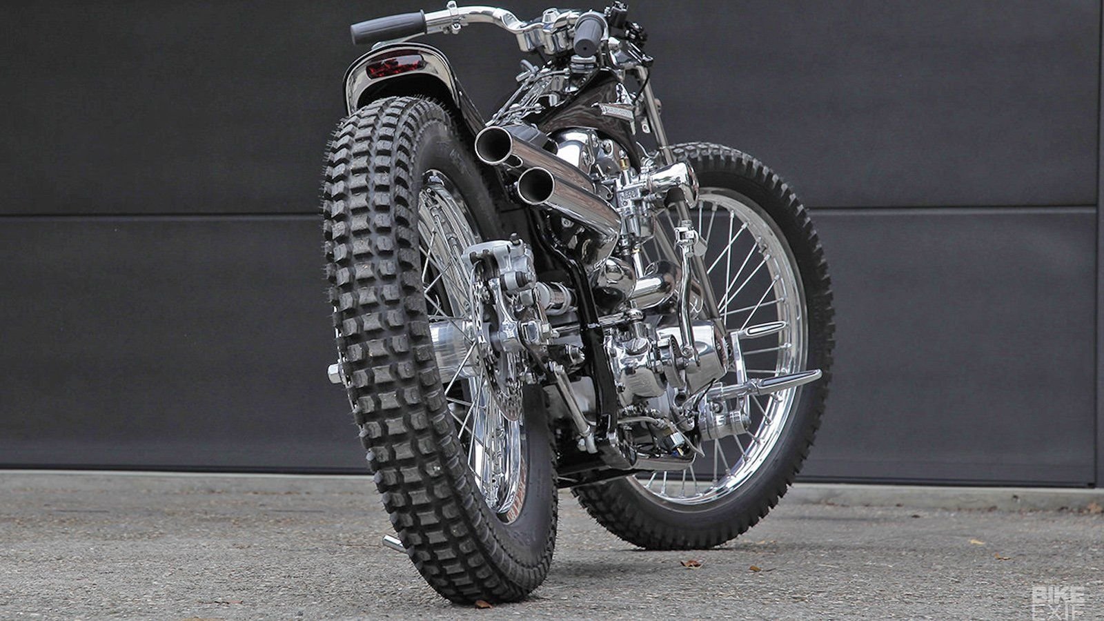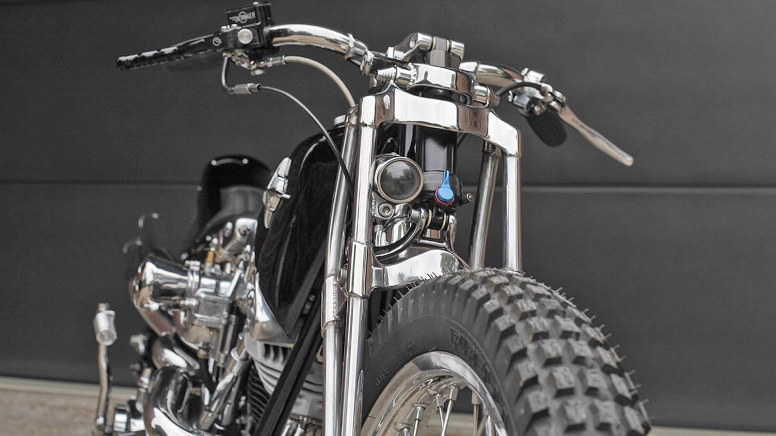 Samuel Aguiar of Shiny Hammer creates furniture and in between projects he built this 1972 FLH Shovelhead. “The idea was to make a low and narrow chopper with trials-type wheels,” remarked Samuel. With that focus in mind, he took the back of the Shovelhead and modified it to have a slim and straight silhouette. It now sits around two inches lower and an inch and a half narrower.