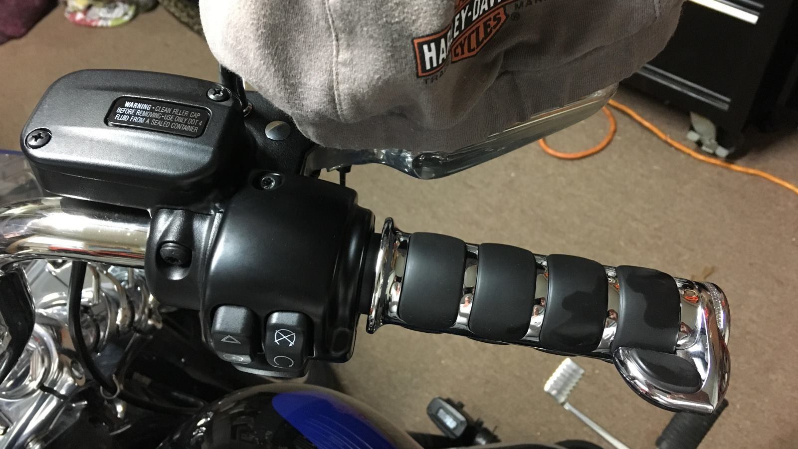 The day came when I rode to the monthly HOG meeting and rode with the chapter on a lunch ride on a warm day in December. I decided it was too nice to wear my gloves and it wasn’t that far away. I noticed after riding several miles, the stock rubber grips seemed thin, so my bare palms stuck to them from constantly squeezing. I looked at more experienced riders and noticed a few of them changed theirs to the nicer chrome grips. I went shopping on JP Cycles website and found this very popular pair of handsome chrome ISO grips. Chrome with rubber finger inserts made the ride more comfortable on my hands. The right-hand grip sports a Throttle “Boss” – a palm rest to give your fingers a squeeze break.