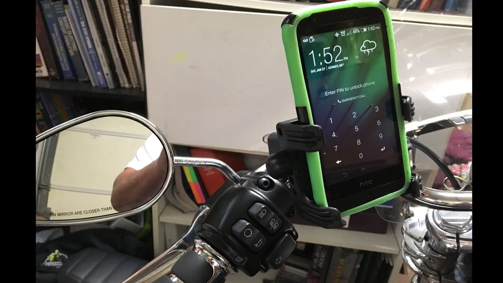 This simple cell phone/device mount allows me to use my I-Phone as a GPS. The new Softail also comes with a USB port under the gas tank so I can bring the charging cord for longer rides.