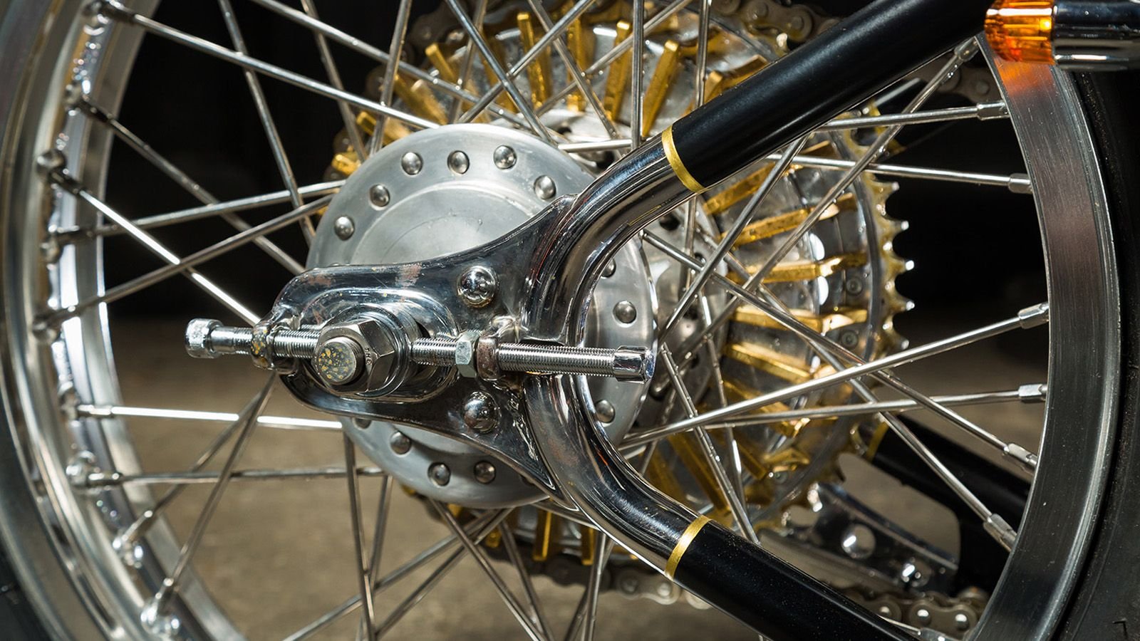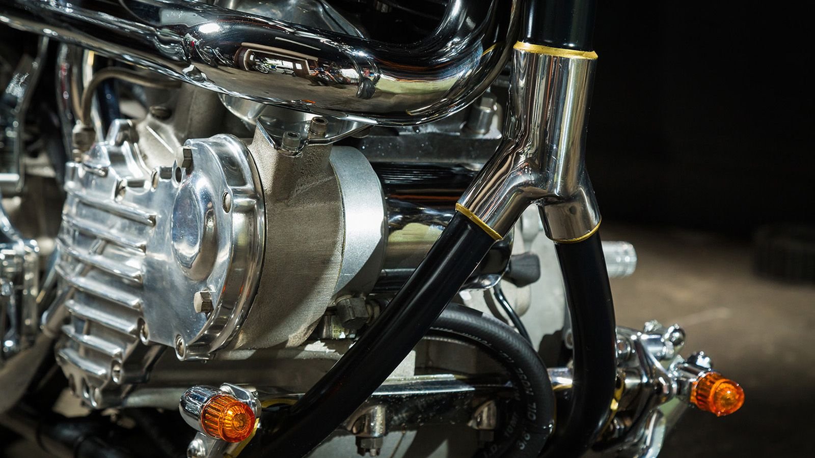 Like mad scientists, Custom Works hatched this road-gobbling creature with their own hands. The frame and tins are built in-house from scratch. To get the stance right, a single downtube chassis was fabricated to exact measurements, while incorporating a touch of stretch. Built as a rider, extra gusseting was strategically added and finished in chrome, creating noticeable accents.