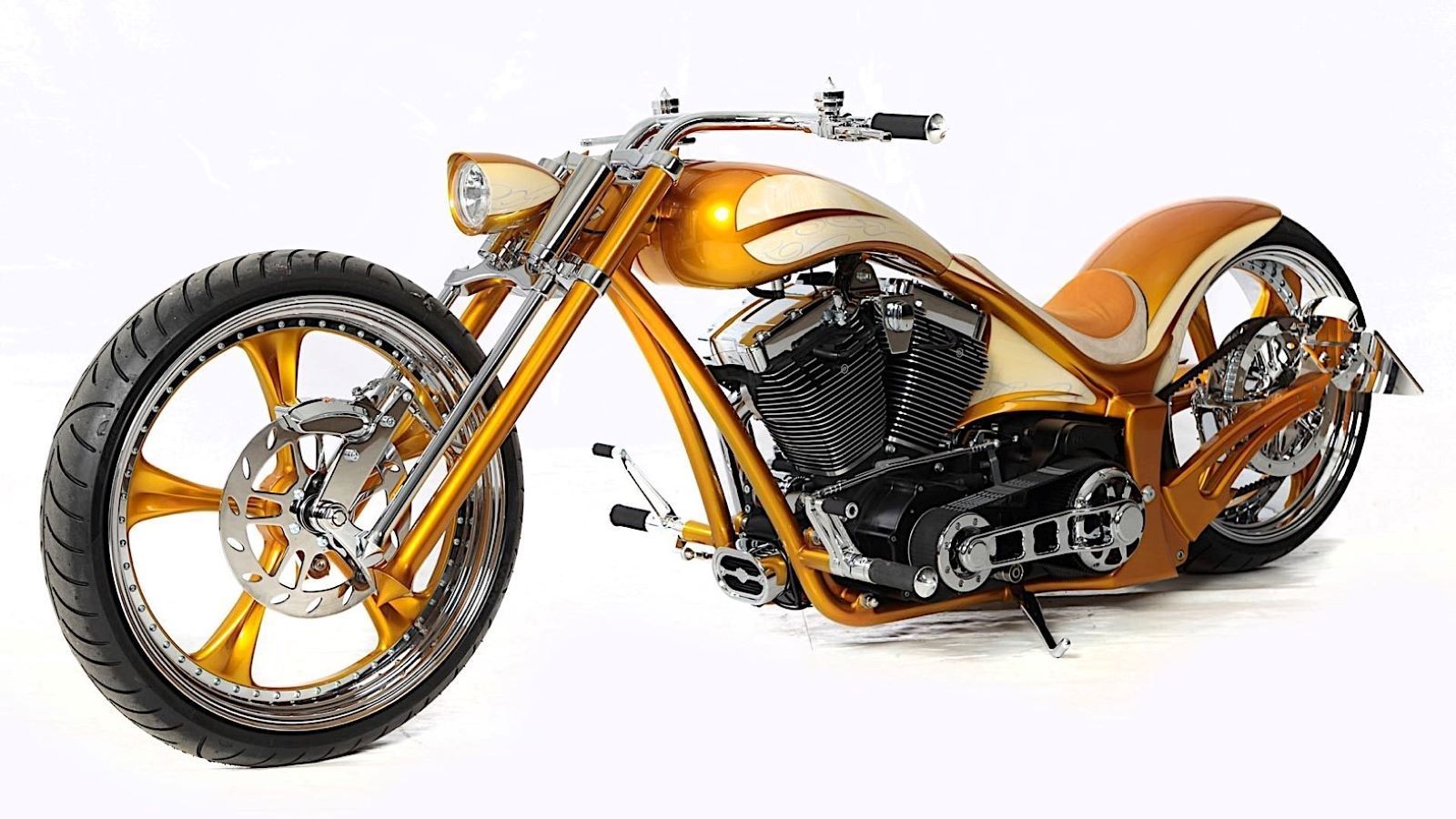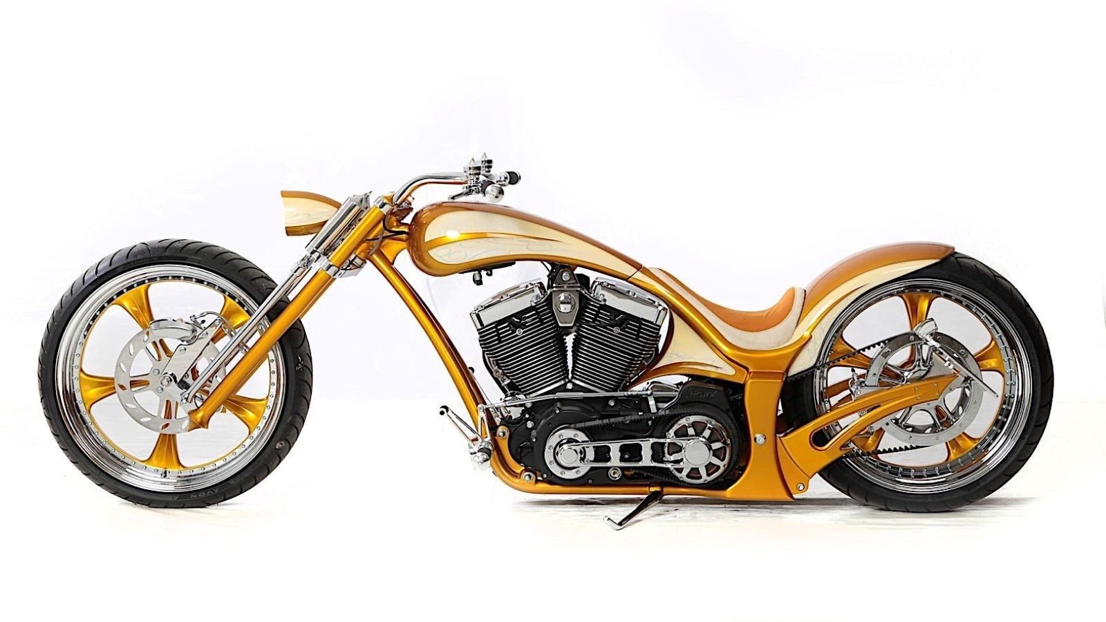 Whether you like gold or loathe it, the basic shape of this bike is certainly hard to debate. Its custom frame and truckload of corresponding Thunderbike and aftermarket parts looks pretty sweet and low slung, and Kruse Design did a nice job of coating it all in a eye-grabbing paint job, too.