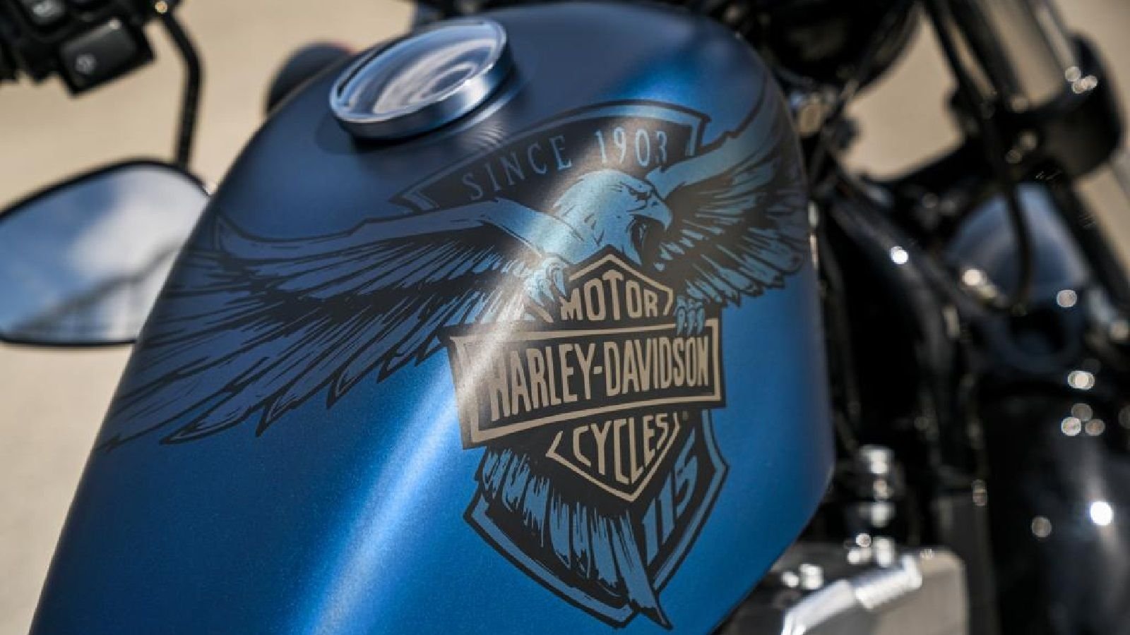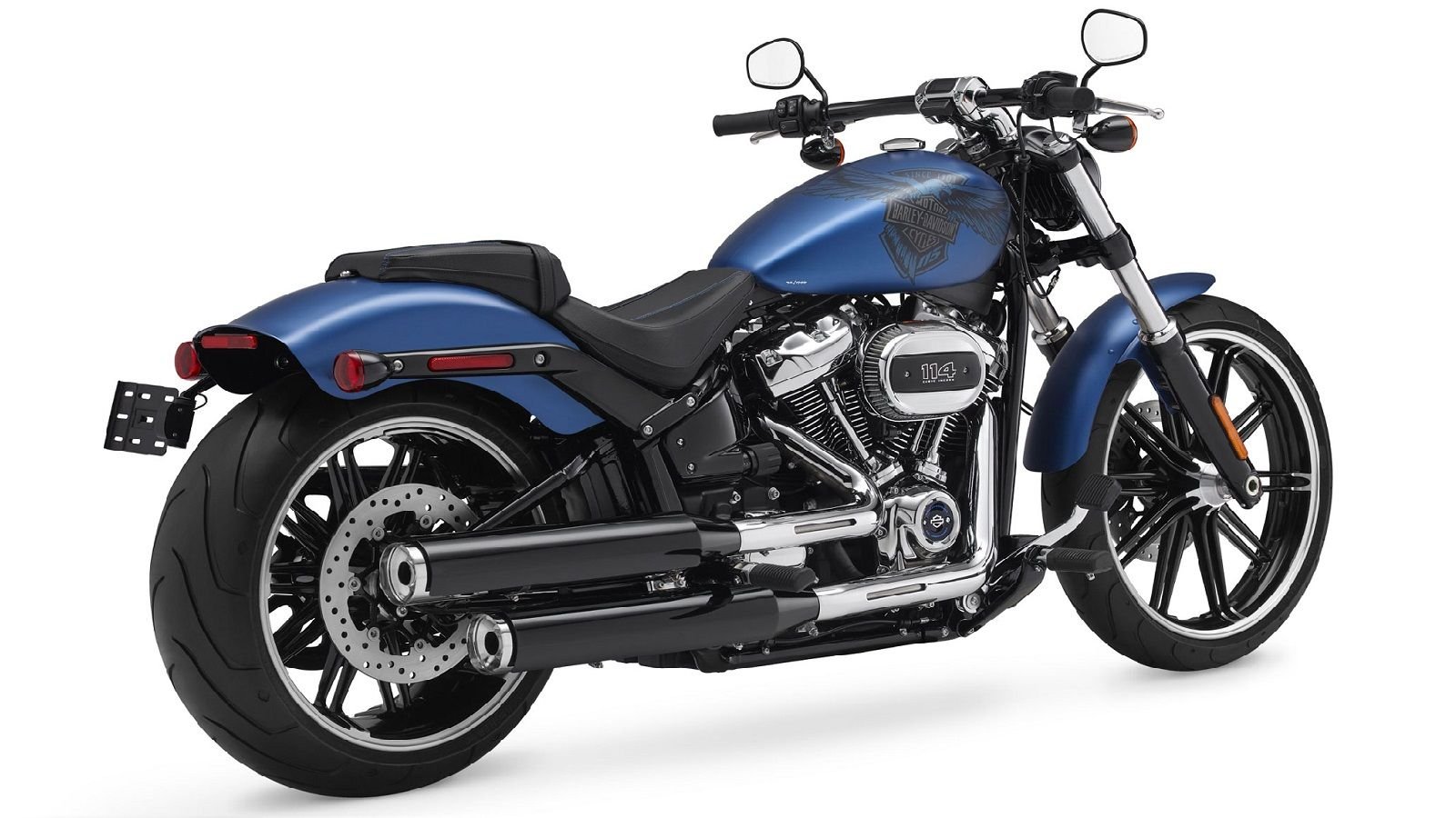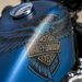 The other limited edition paint scheme offered by Harley is their 115th Anniversary Denim paint. This satin-like paint comes in their Legend Blue "Denim" with a large eagle holding a Harley-Badge which covers the majority of the fuel tank or batwing fairing depending on the model. These Denim bikes will be equipped with the same color-stitched, embossed logo seat as on the Two-Tone paint scheme models. The Anniversary Denim will be available on the Street Glide Special, Breakout (shown above), Forty-Eight, and Fat Boy models, with the Fat Boy being the only motorcycle that can be purchased in either of the anniversary paint schemes.