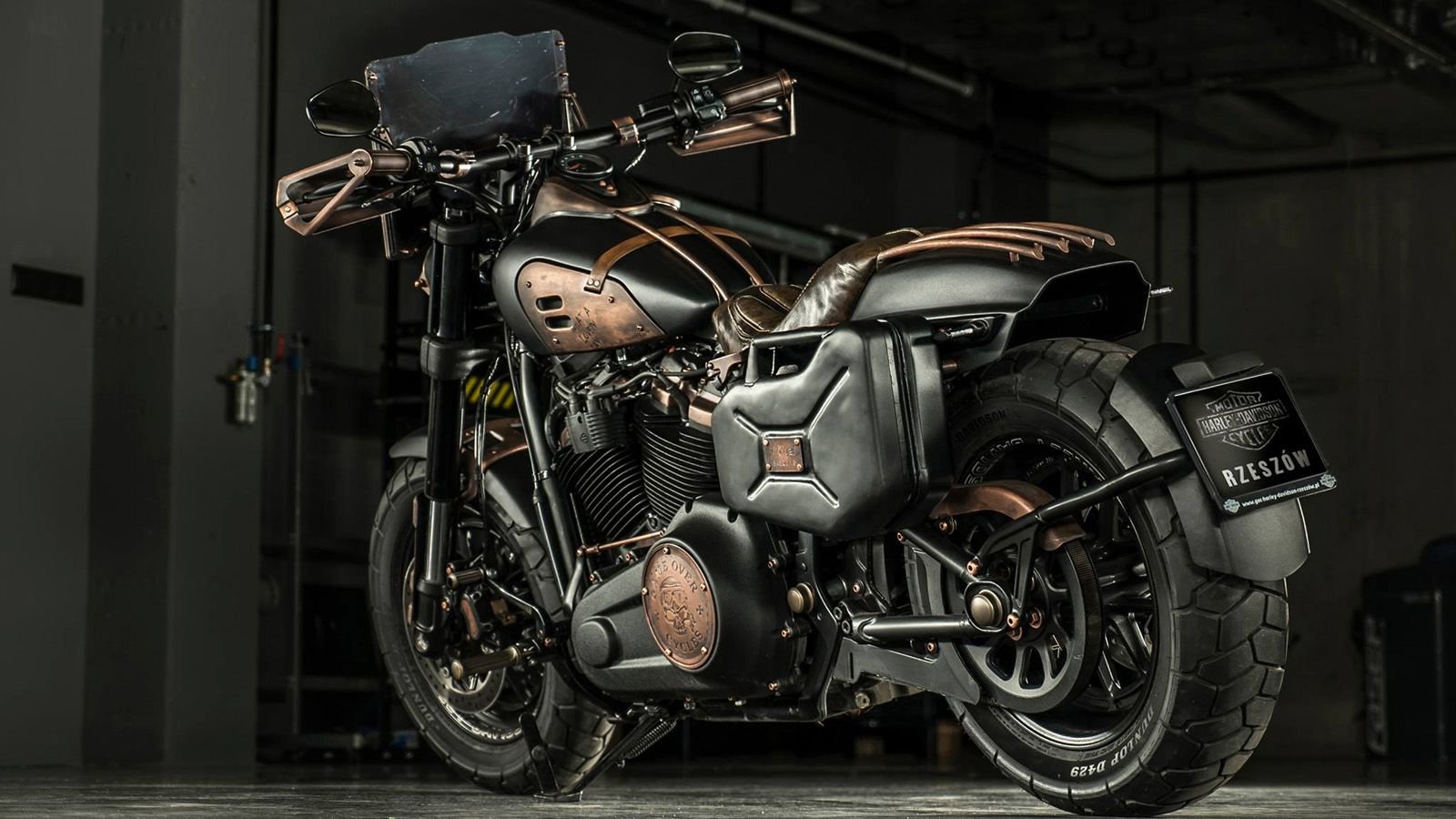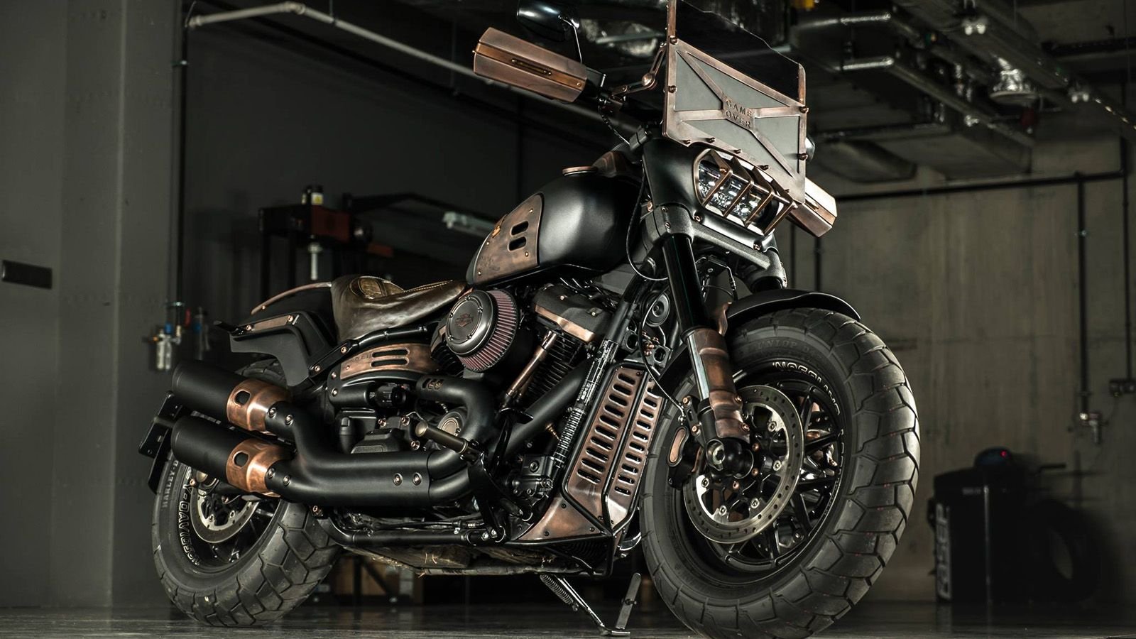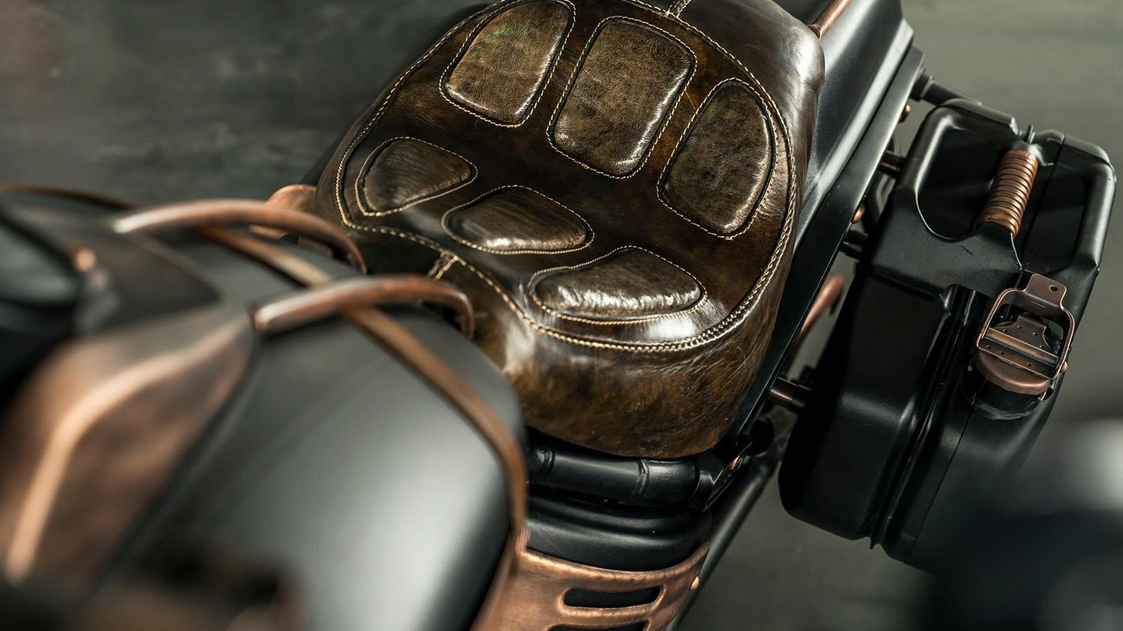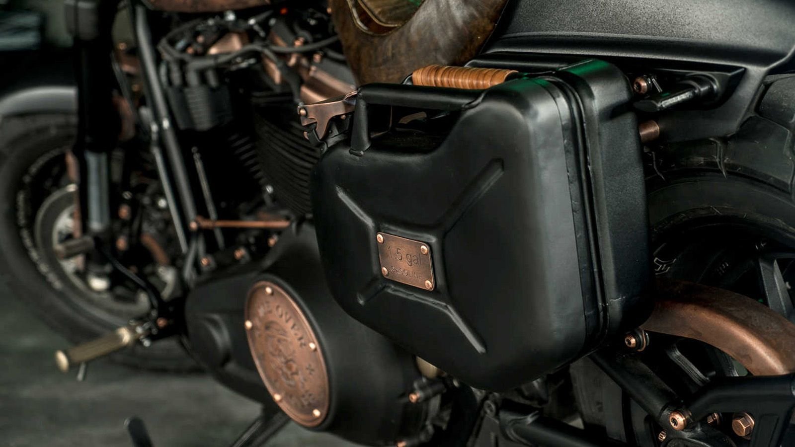 Mad Max has also earned a cult following and is credited for inspiring many a young rider. Modified vehicles and custom bikes are the central feature of the story line. Even more key is the desperate and often murderous hunt for gasoline. True to form, Game Over Cycles have included a spare five-gallon tank with their copper-covered, post-apocalyptic Fat Bob.