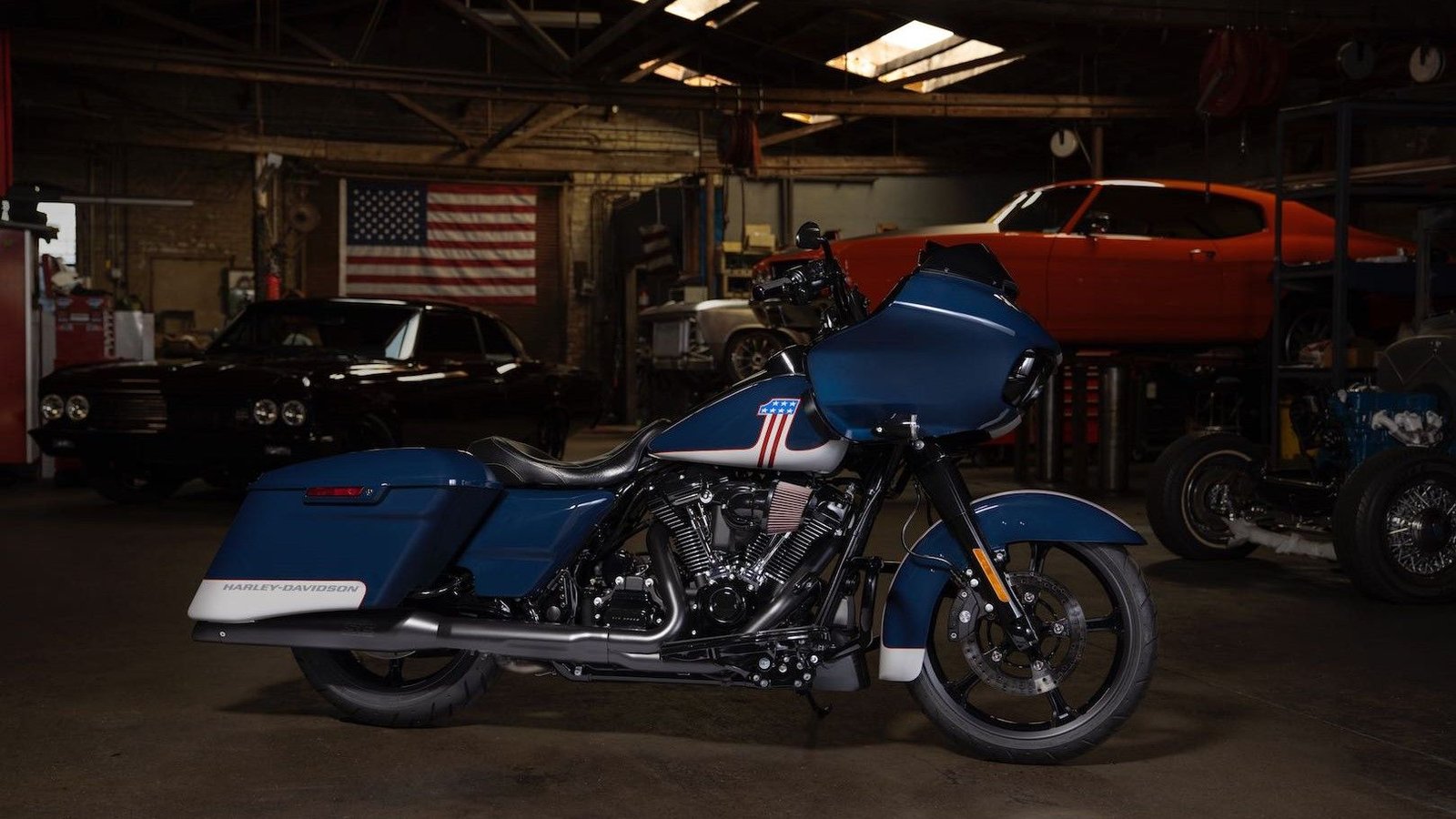 Customers can choose between Billiard Red/Stone Washed White or Billiard Blue/Stone Washed White, both of which feature the "Number One" logo in red and blue on the fuel tank, along with an H-D script logo over the secondary color on the lower saddlebags.