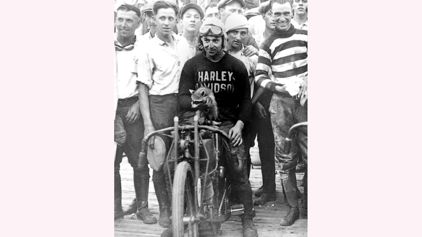 The pig, and the dog were not the only animal who became a famous figure for Harley-Davidson. Way back in the day, when most racers were farm boys, a photo of a Harley racer was discovered giving a victory lap to a raccoon! Just think, if the raccoon had taken over the mascot role, H.O.G. may have been the "Coon" association? Would Harley-Davidson bikes have been known as coons instead of hogs? And what about the ever-popular T-shirts?