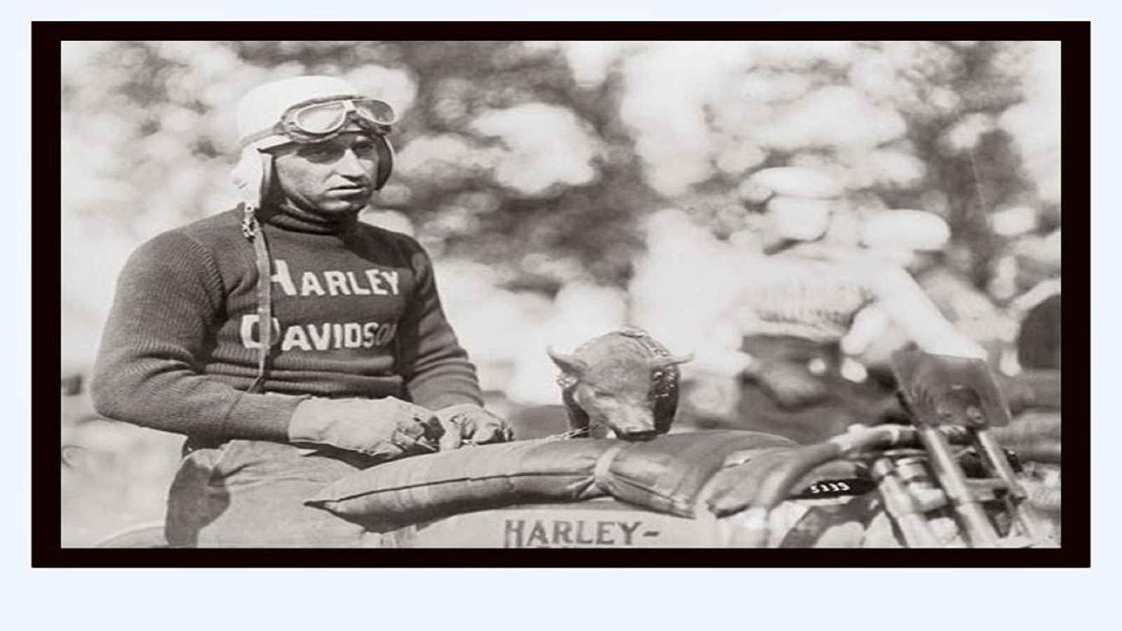 In 1903, the year the Wright Brothers flew their first airplane, Harley-Davidson built its first motorcycle. Many companies tried to make it in the new motorcycle market, but the ones who survived were the ones who could win on the race track. By 1910, the Harley-Davidson factory team was winning so much they got the nickname "Wrecking Crew". Just after WWI, one of the HD team took a dog for a victory lap after a race. This was believed to be the first time a mascot was used by Harley.