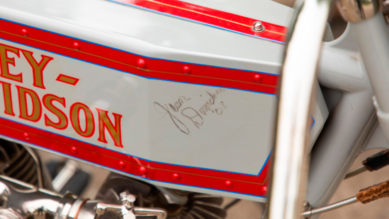 Apart from this bike's rarity, the feature that stands out the most is Jean Davidson's signature on the tank. Jean is the granddaughter of Walter Davidson, Harley-Davidson's first president.